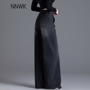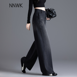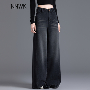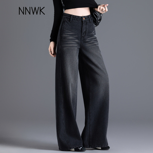 女2025新宽松加绒直筒拖地裤 阔腿牛仔裤 四面弹窄版 时髦侧开叉