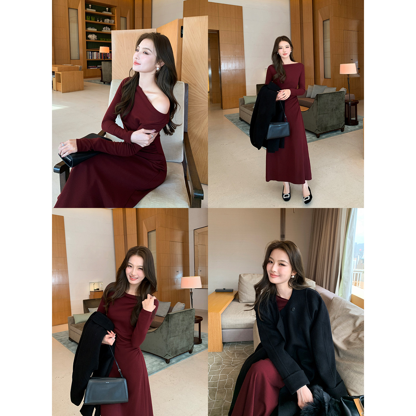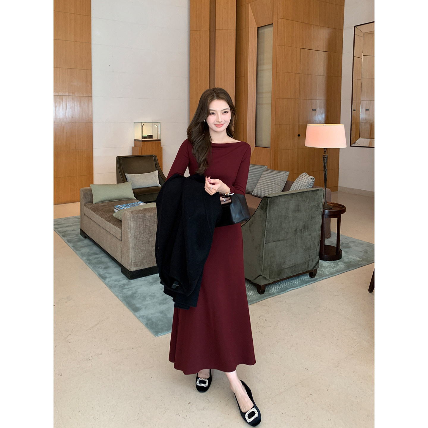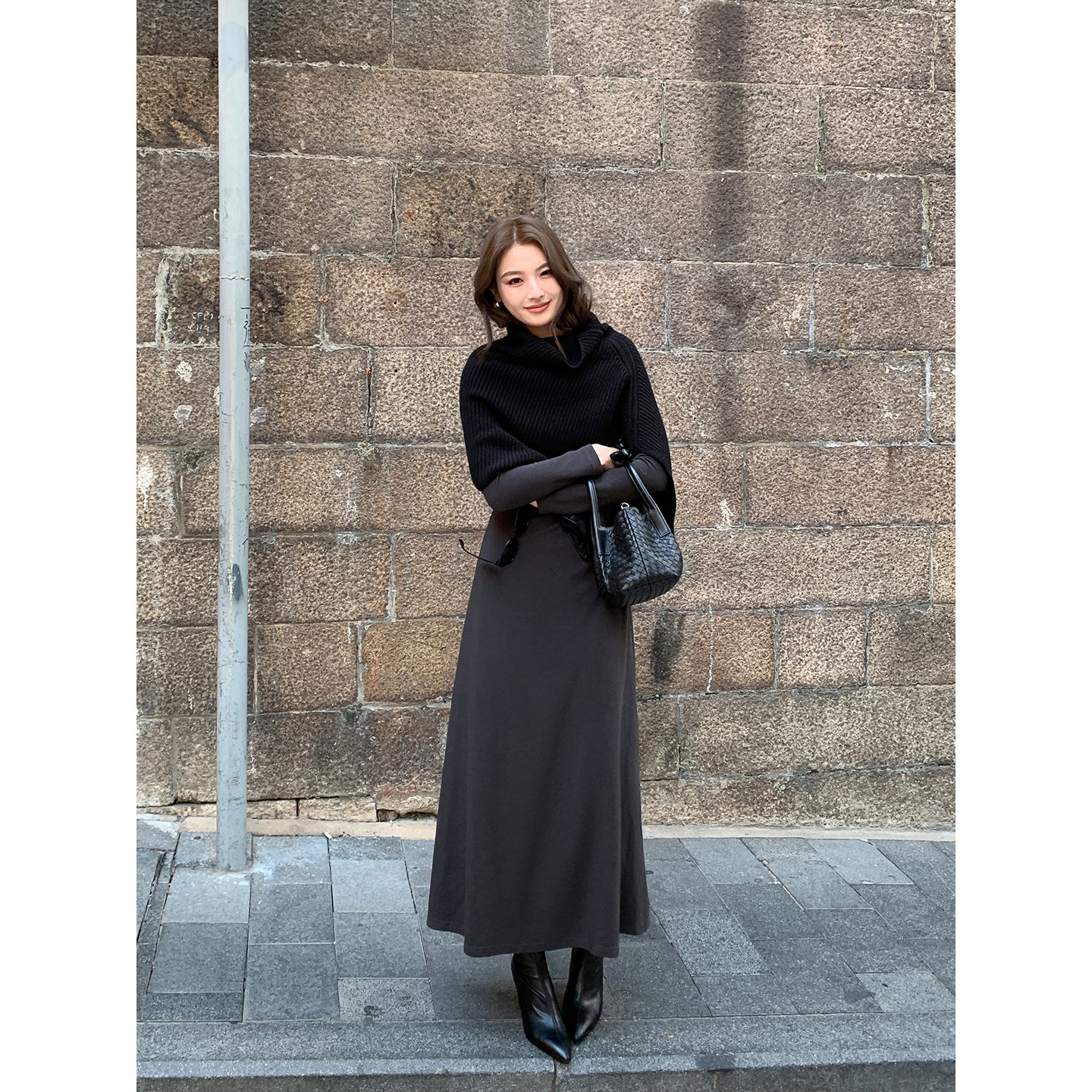 一字船领针织连衣裙女气质修身 轻解构捏褶 大摆A字裙 Lin Maven
