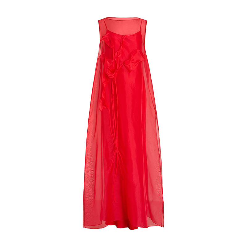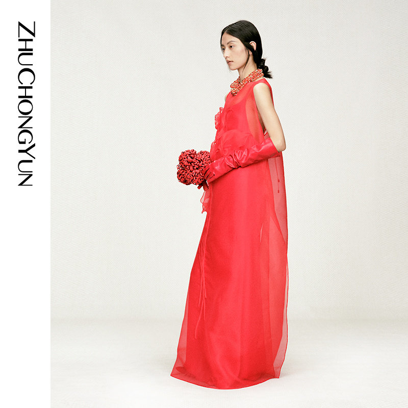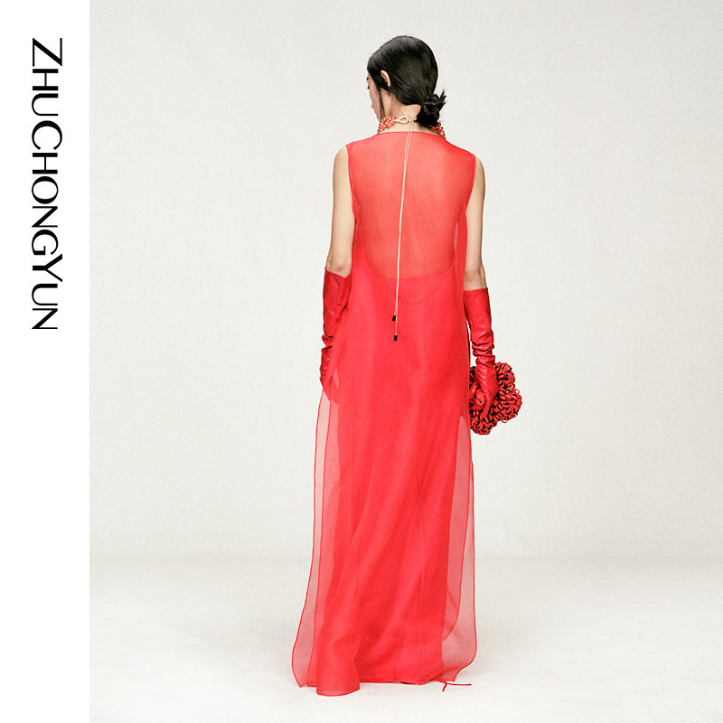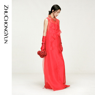 红色欧根纱A型双层洋装 ZHUCHONGYUN2026春新款 6A级真丝