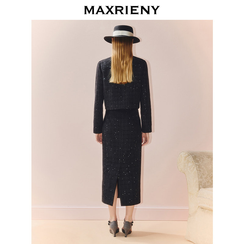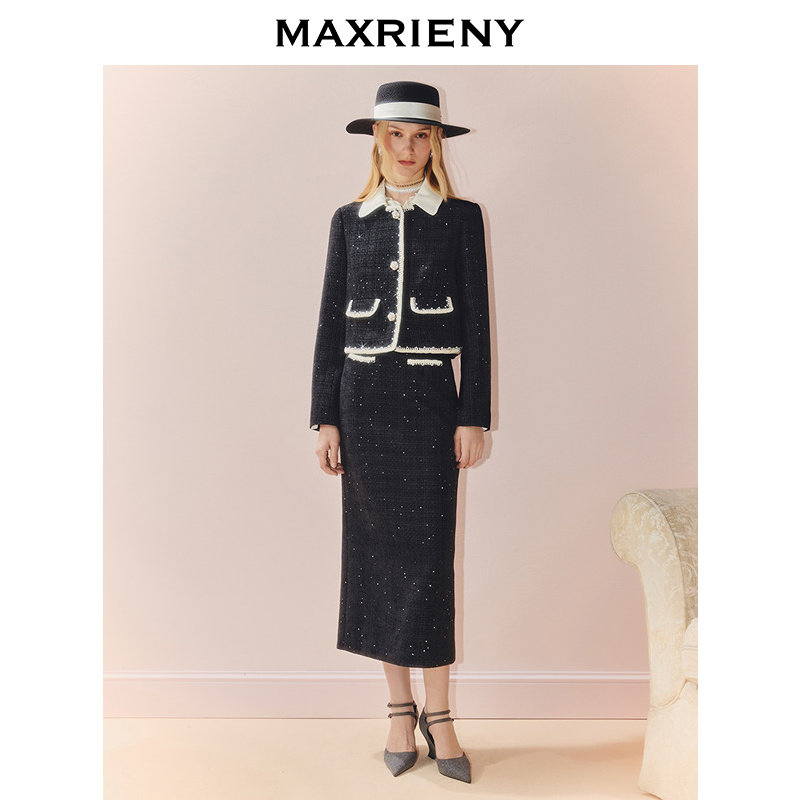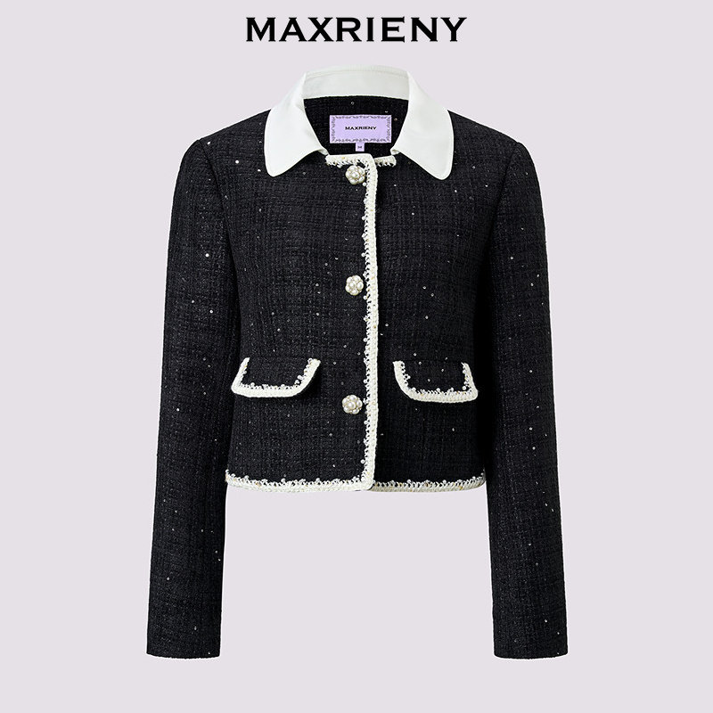 MAXRIENY小香风花纱外套千金miu系穿搭25秋撞色亮片箱型翻领设计