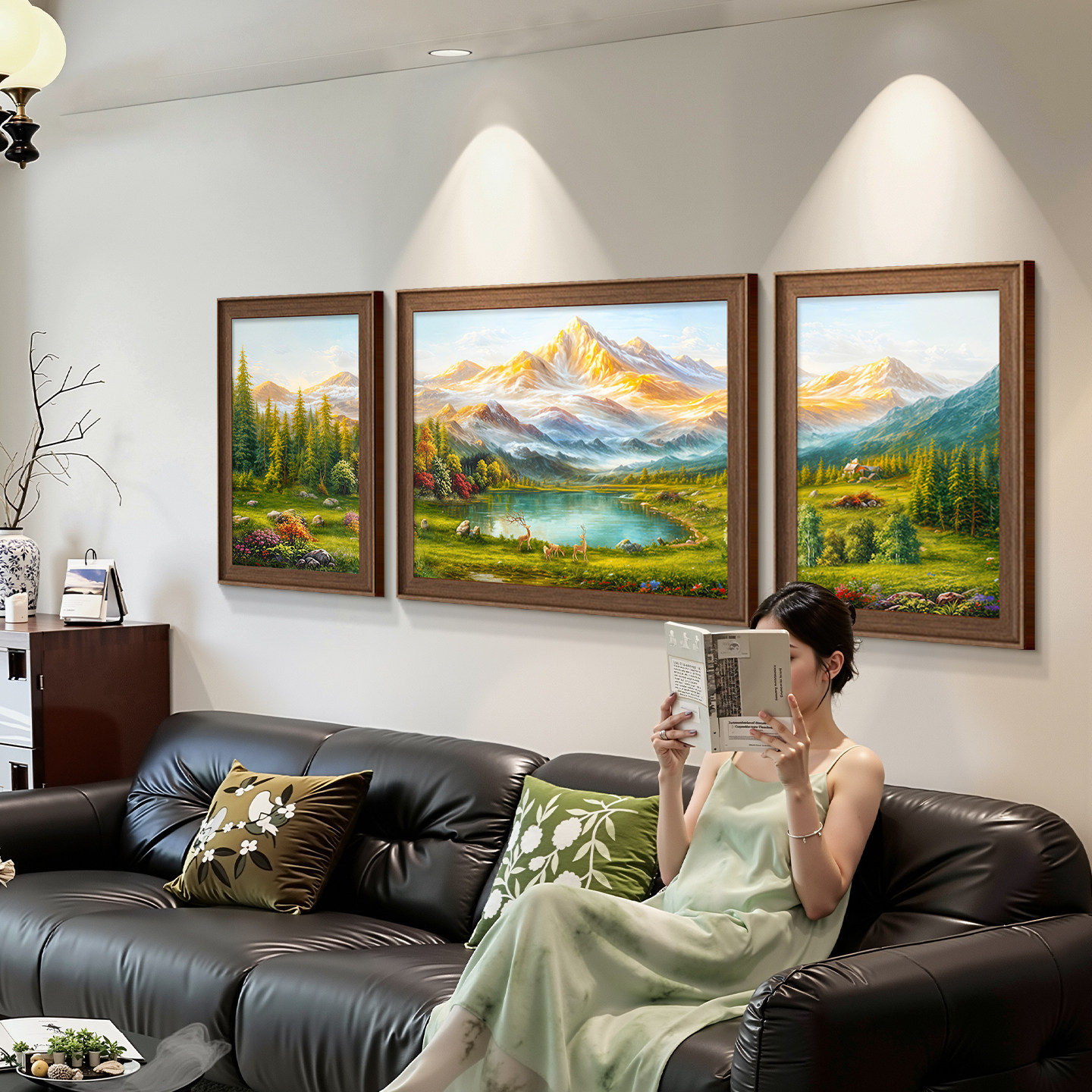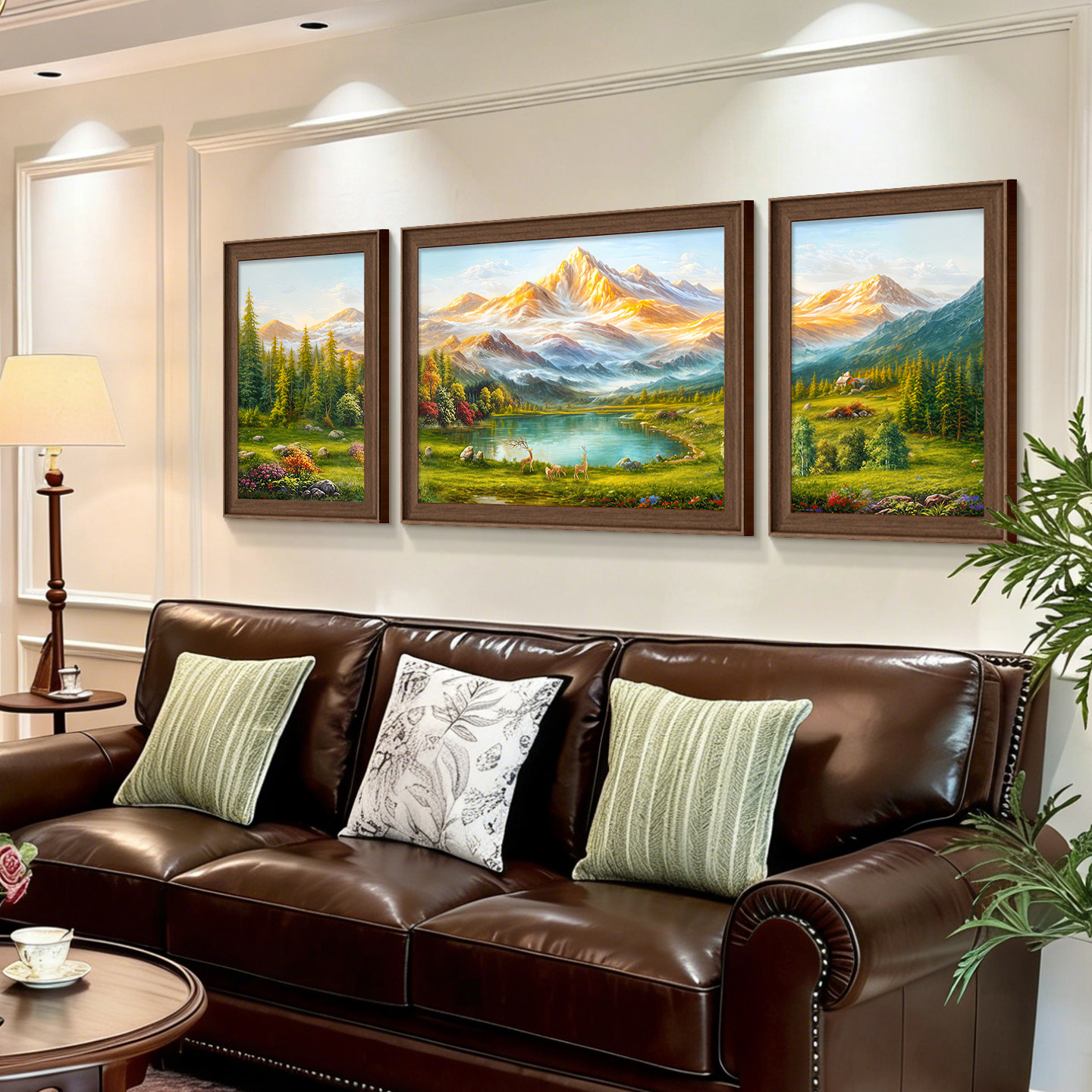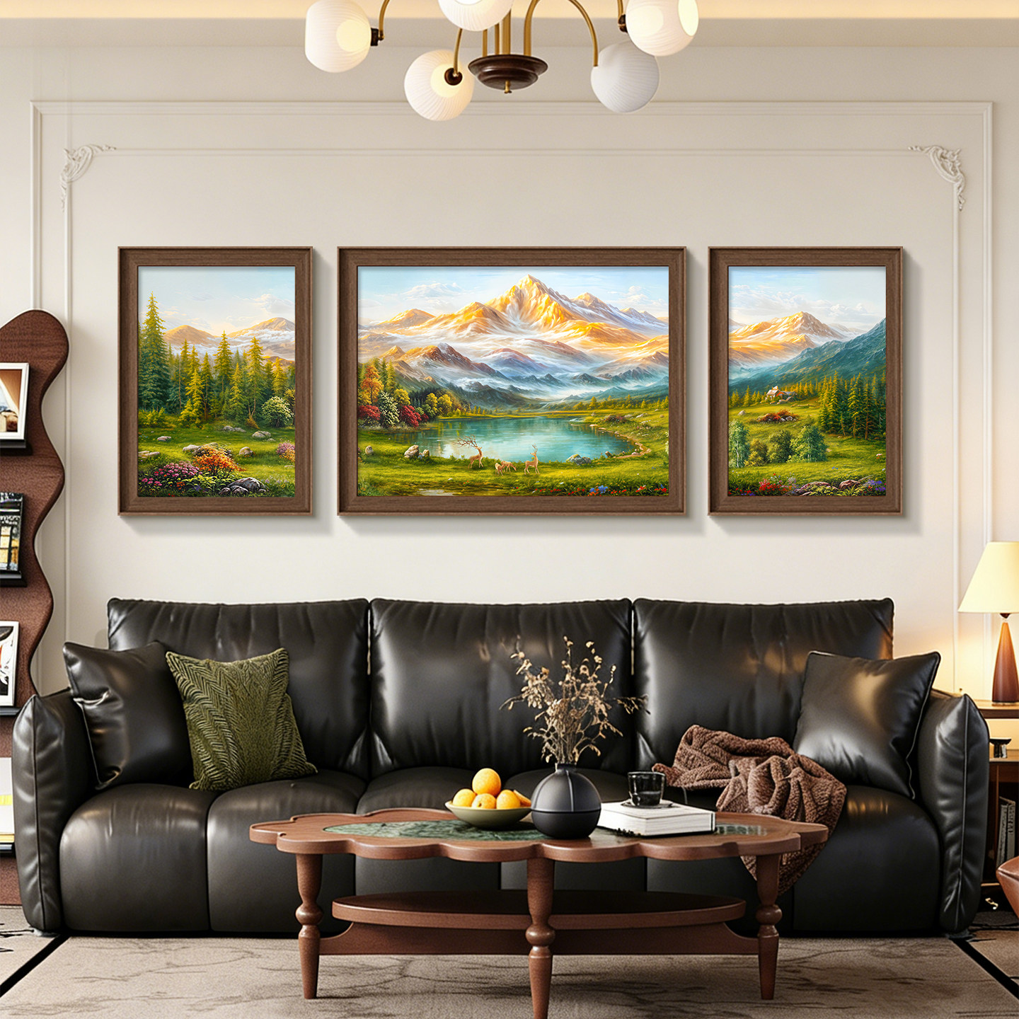 聚宝盆山水画靠山图美式 饰画沙发背景墙挂画背有靠山油画 客厅装