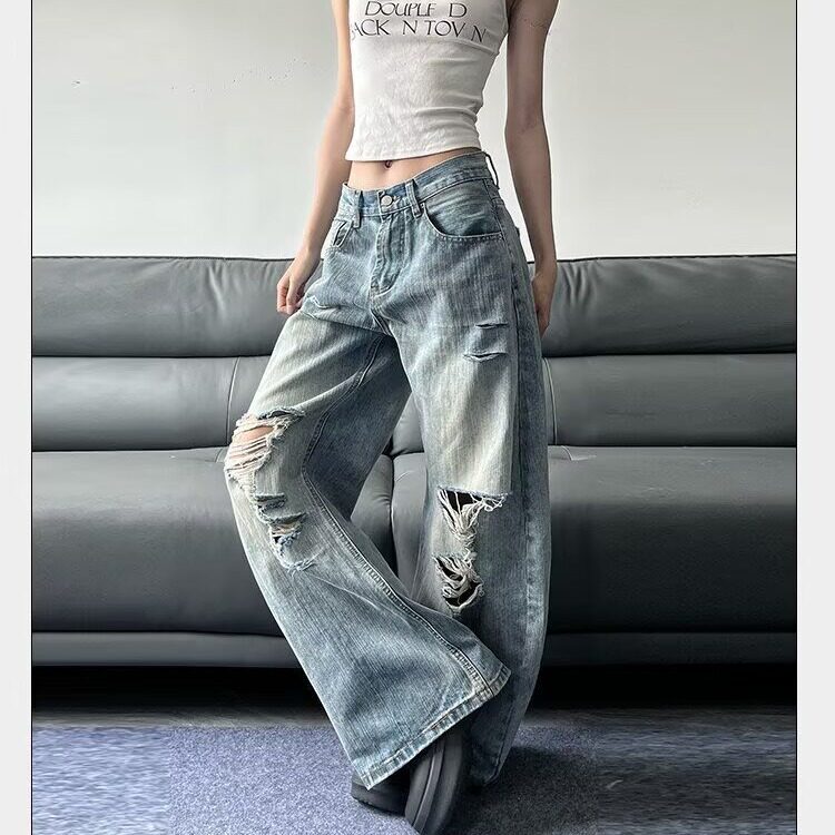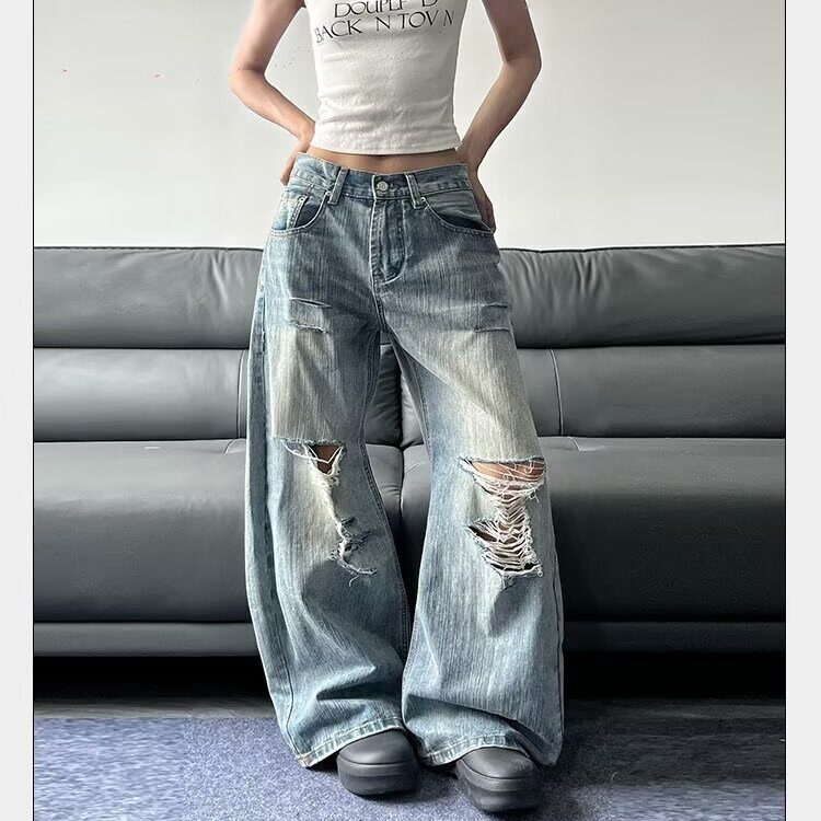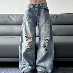 潮 男女宽松阔腿破洞设计感长裤 2026春季 复古做旧拆破竹节纹牛仔裤