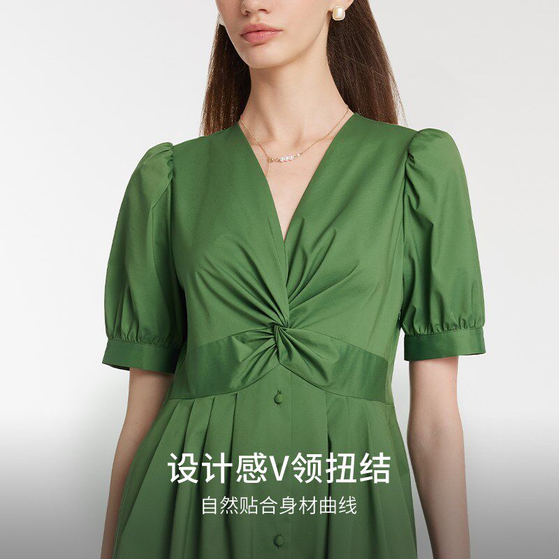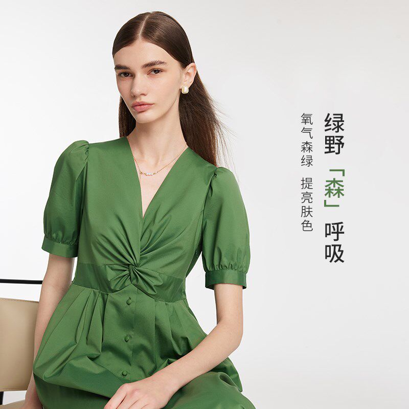 速发绿色连衣裙时尚 好看V4扭结棉布A字1裙C领C4K460 2024夏季