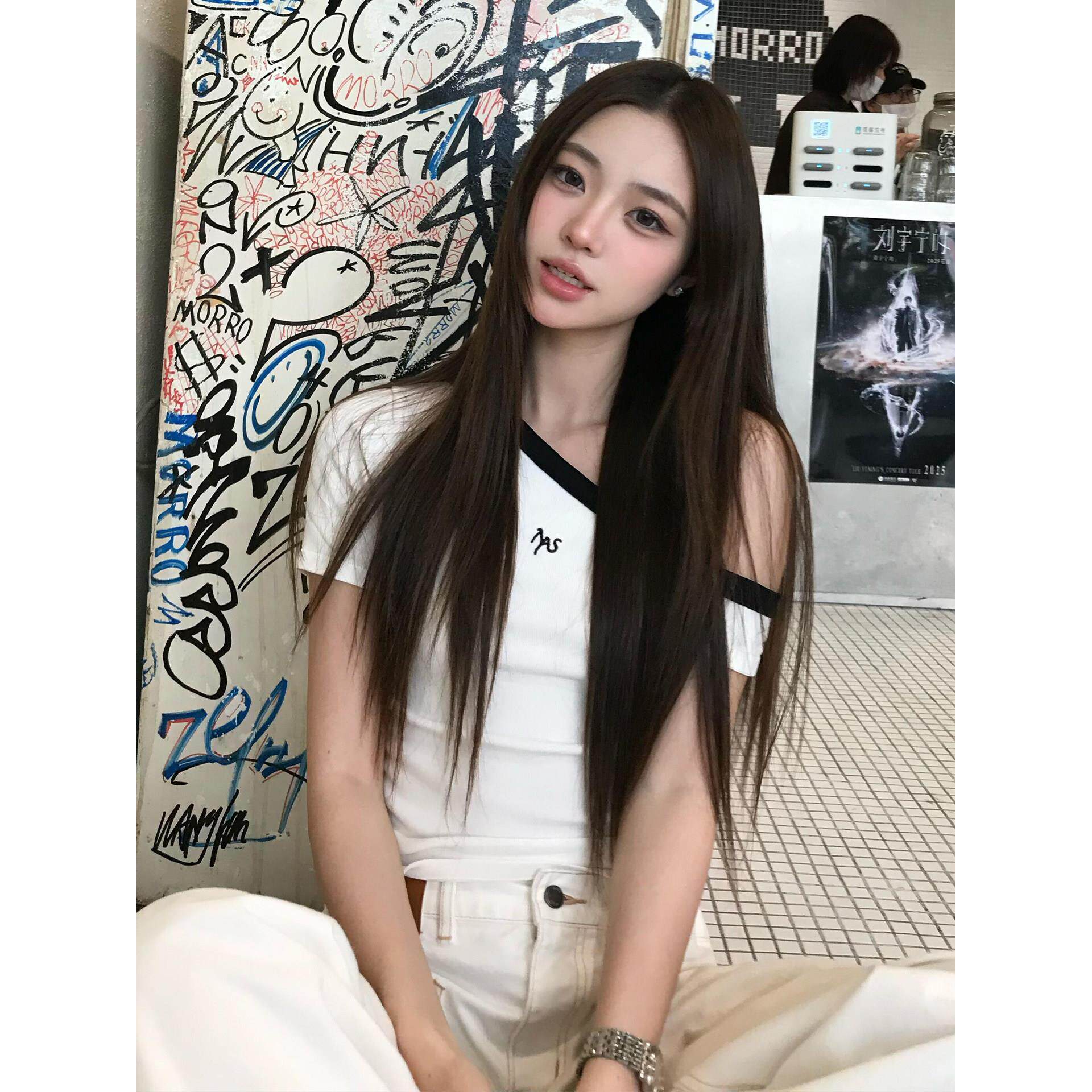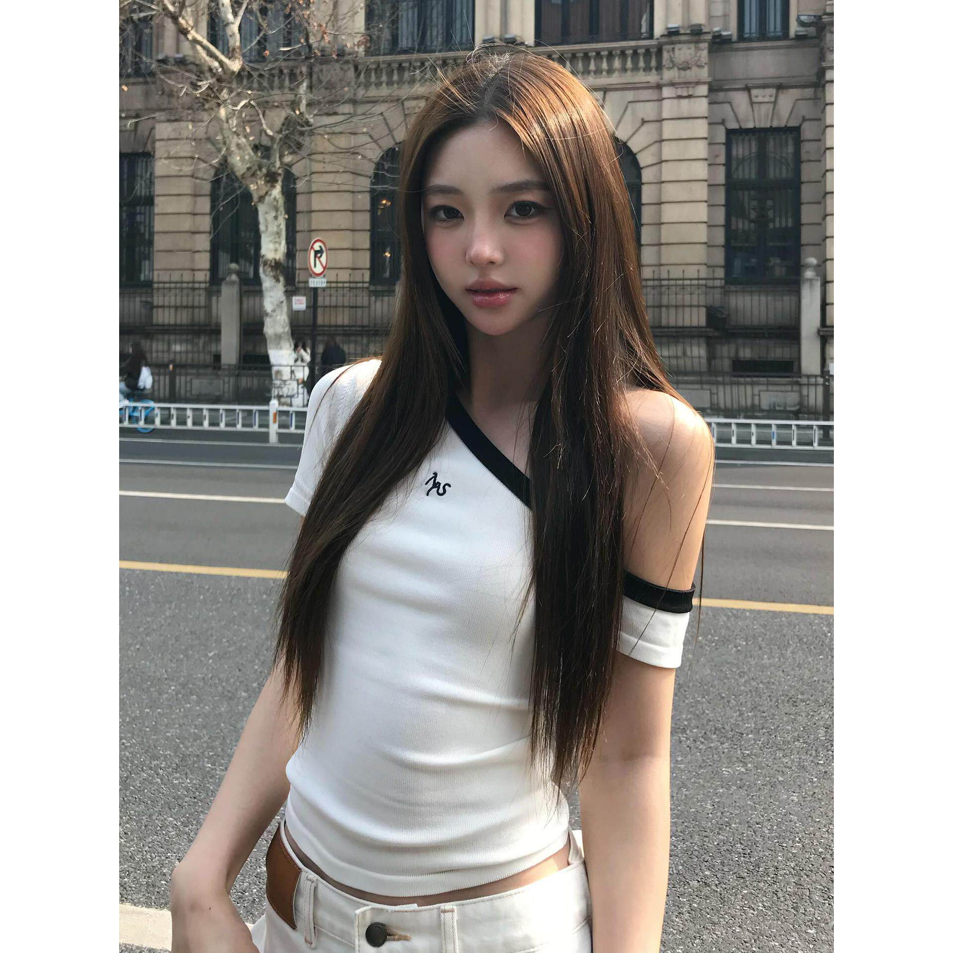 修身 新款 显瘦设计感白色斜肩上衣 T恤女夏季 辣妹风不对称露肩短袖