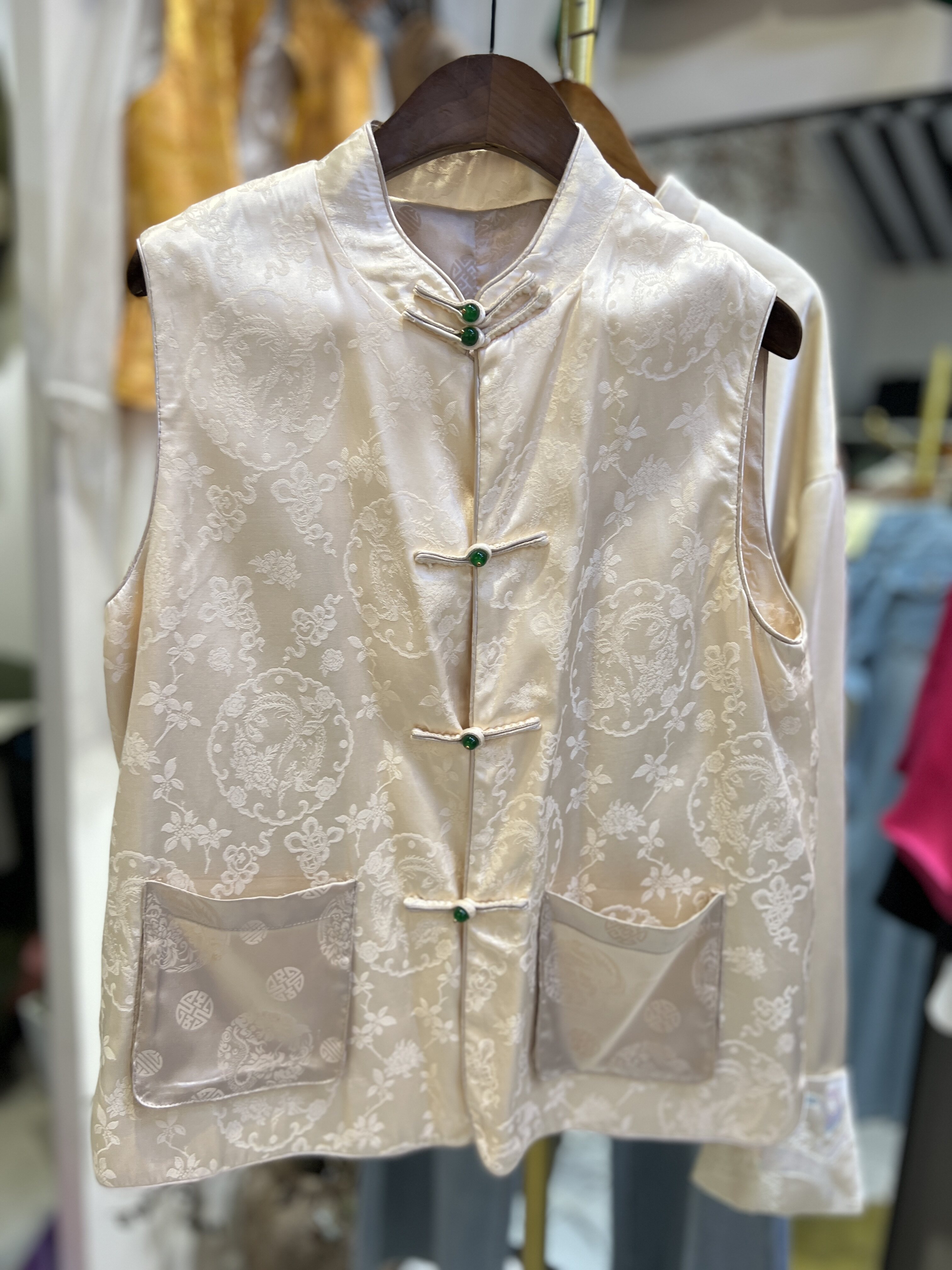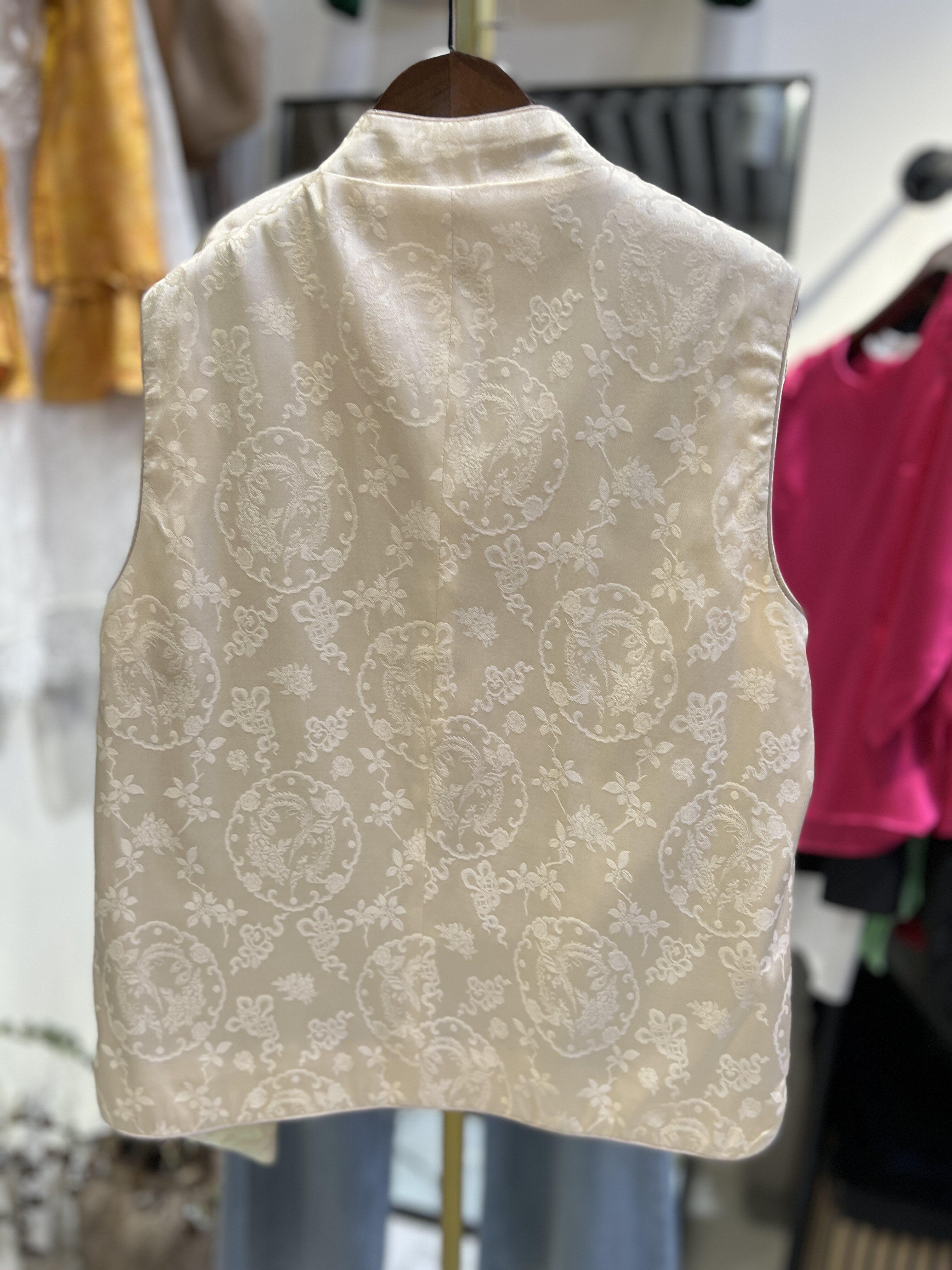轻奢欧货原创设计宽松百搭立领盘扣提花醋酸国风马甲女上衣