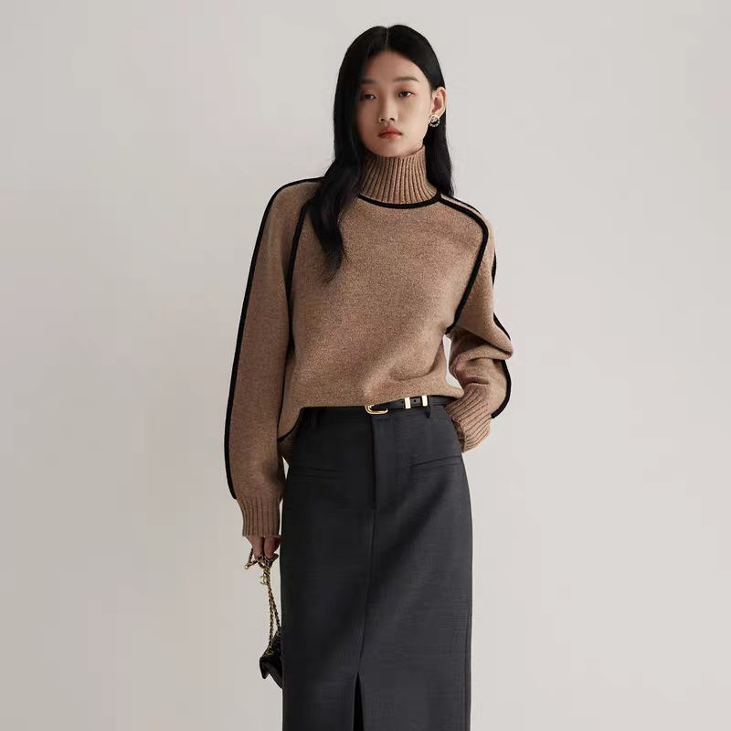 撞色高领插肩灯笼袖 设计感小众针织上衣 毛衣女秋冬内搭慵懒风法式