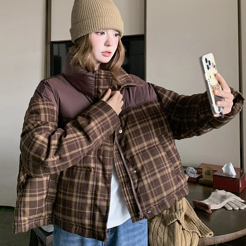 宽松白鸭绒拼接加厚立领羽绒服女 短款 拼色格子2025新款 百搭时尚