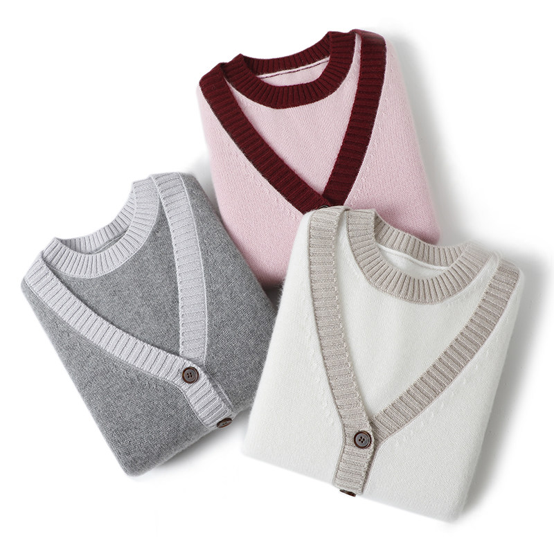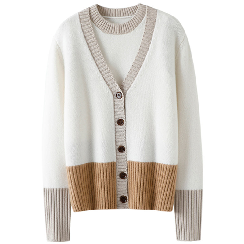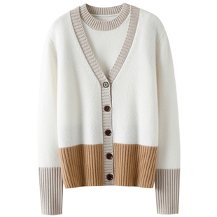 女拼色毛衣背心针织外套套装 给你隐形话语 加厚100%纯山羊绒开衫