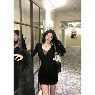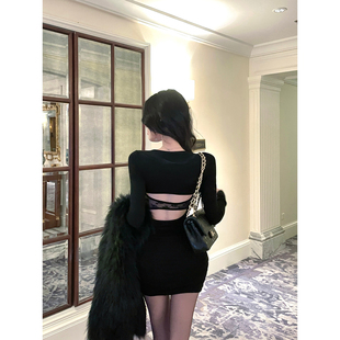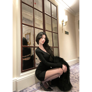 显瘦长裙子 黑色丝绒连衣裙气质打底绝美仙女裙修身 NANA法式
