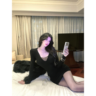 辣妹黑色闪闪亮片吊带连衣裙2025秋季 性感名媛收腰显瘦包臀短裙