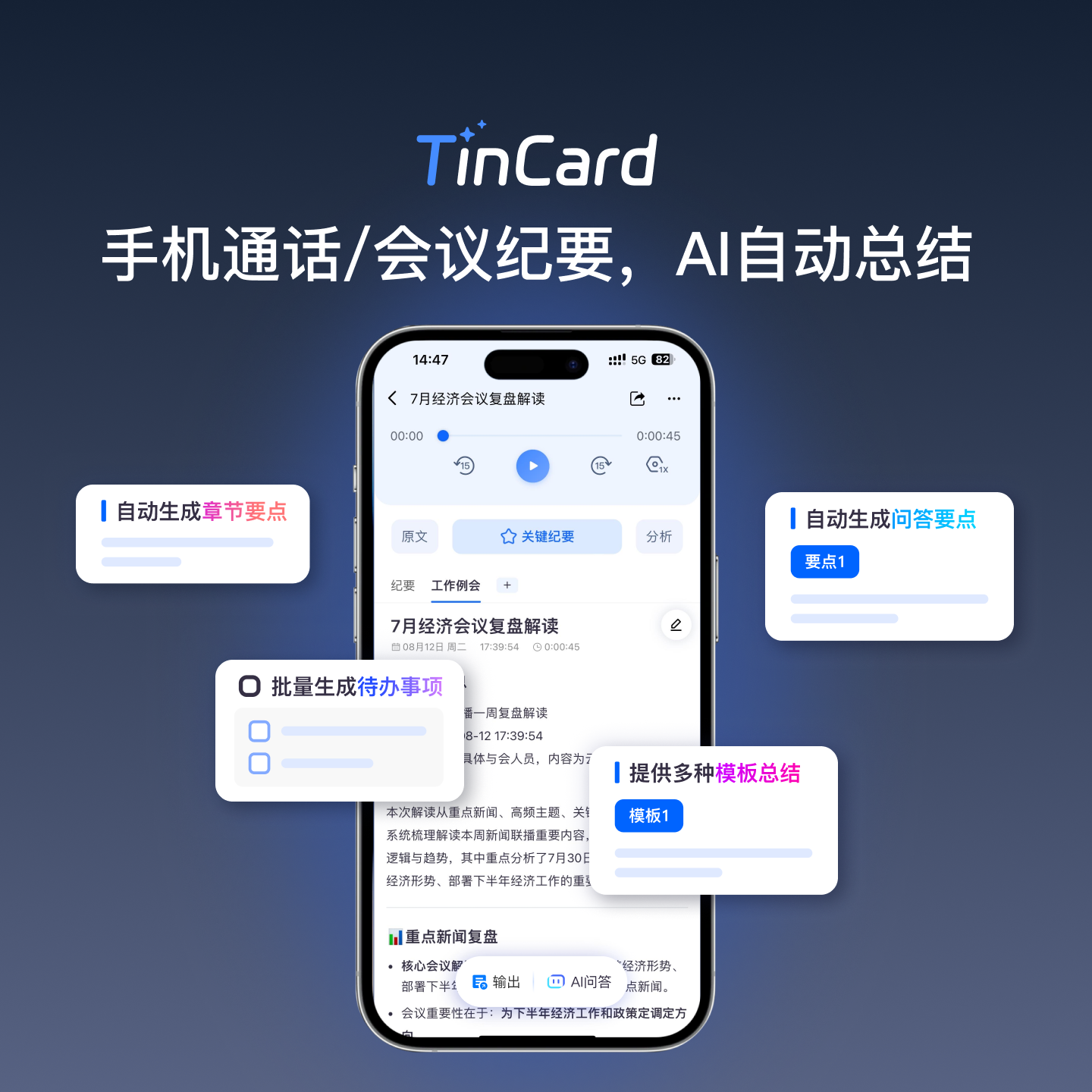 TinCard全新录音笔手机通话录音AI助理会议纪要实时转写磁吸便携