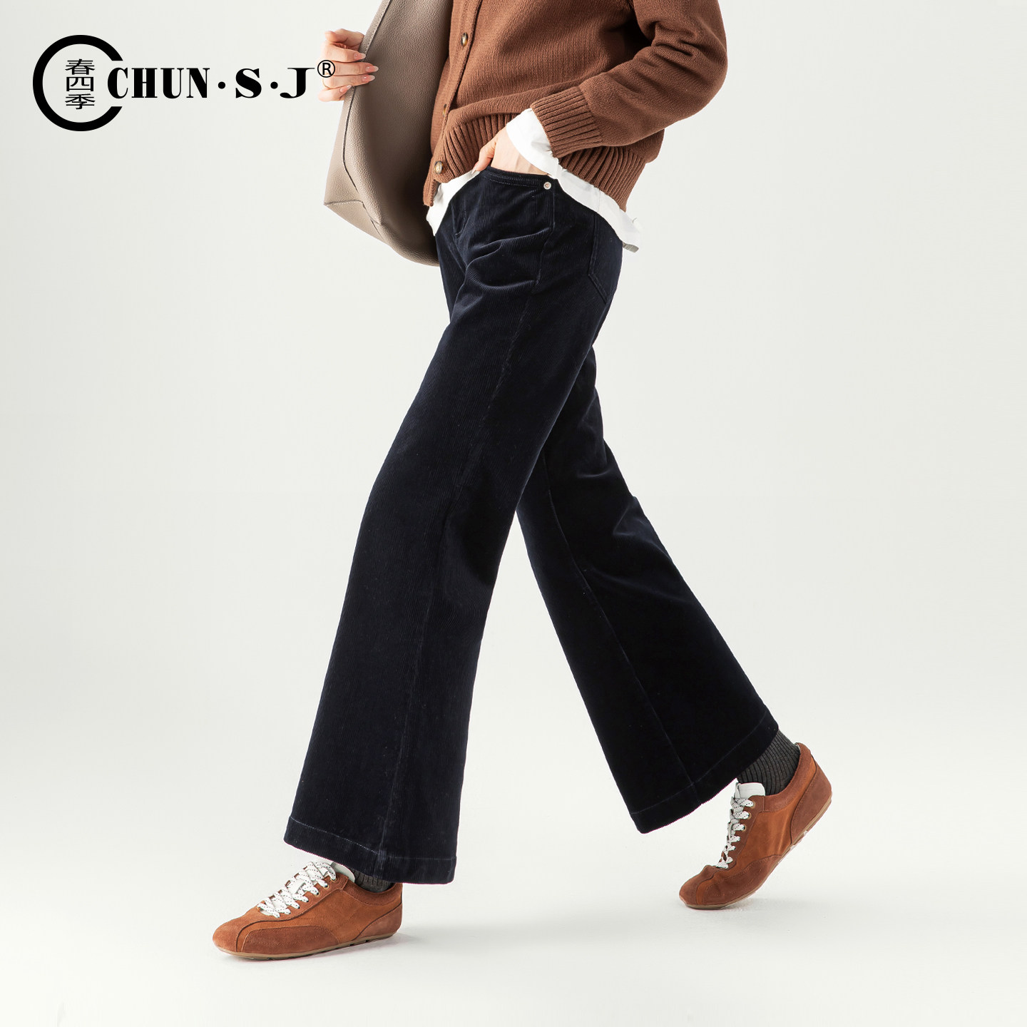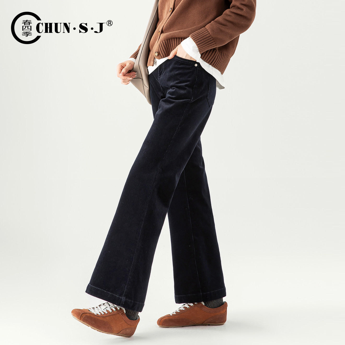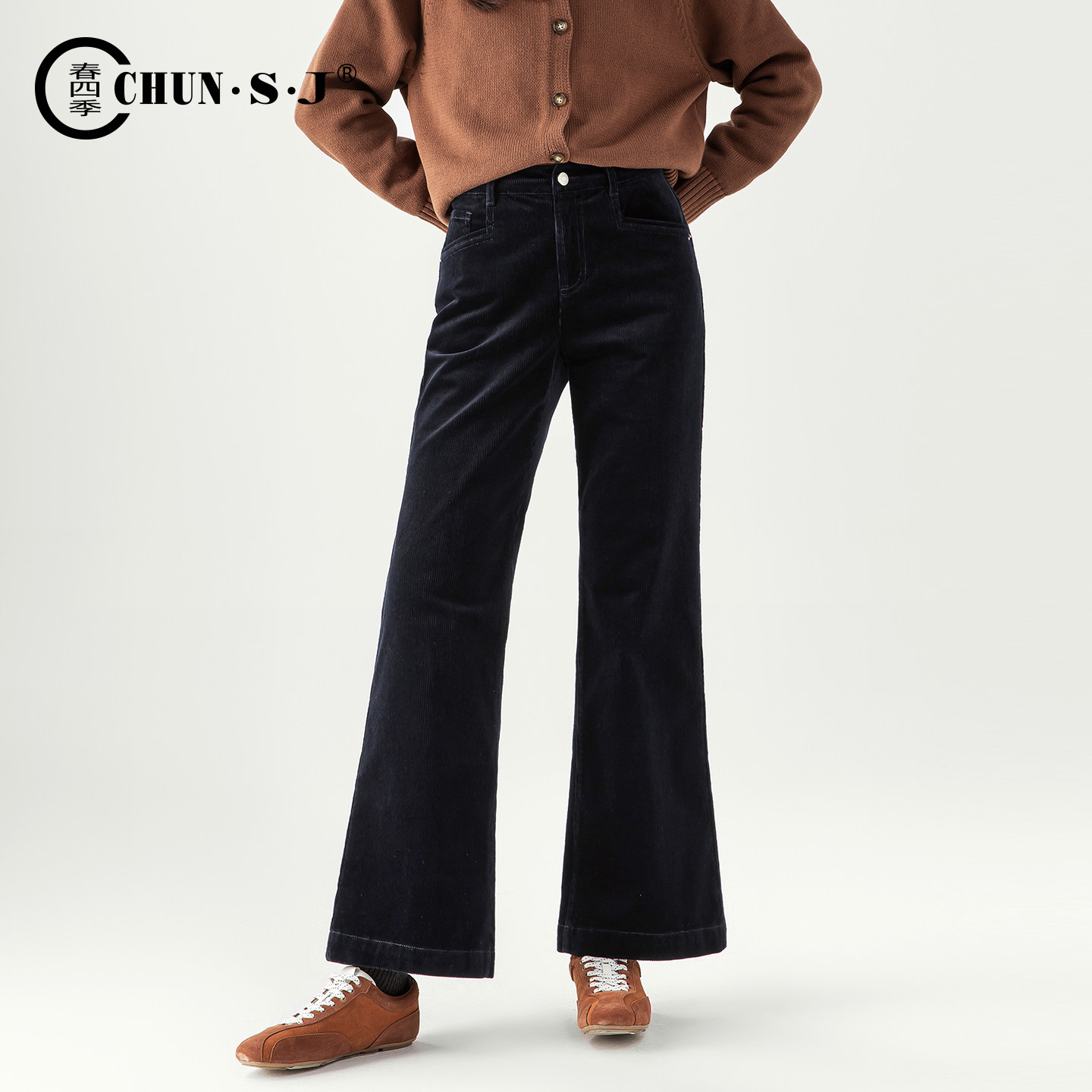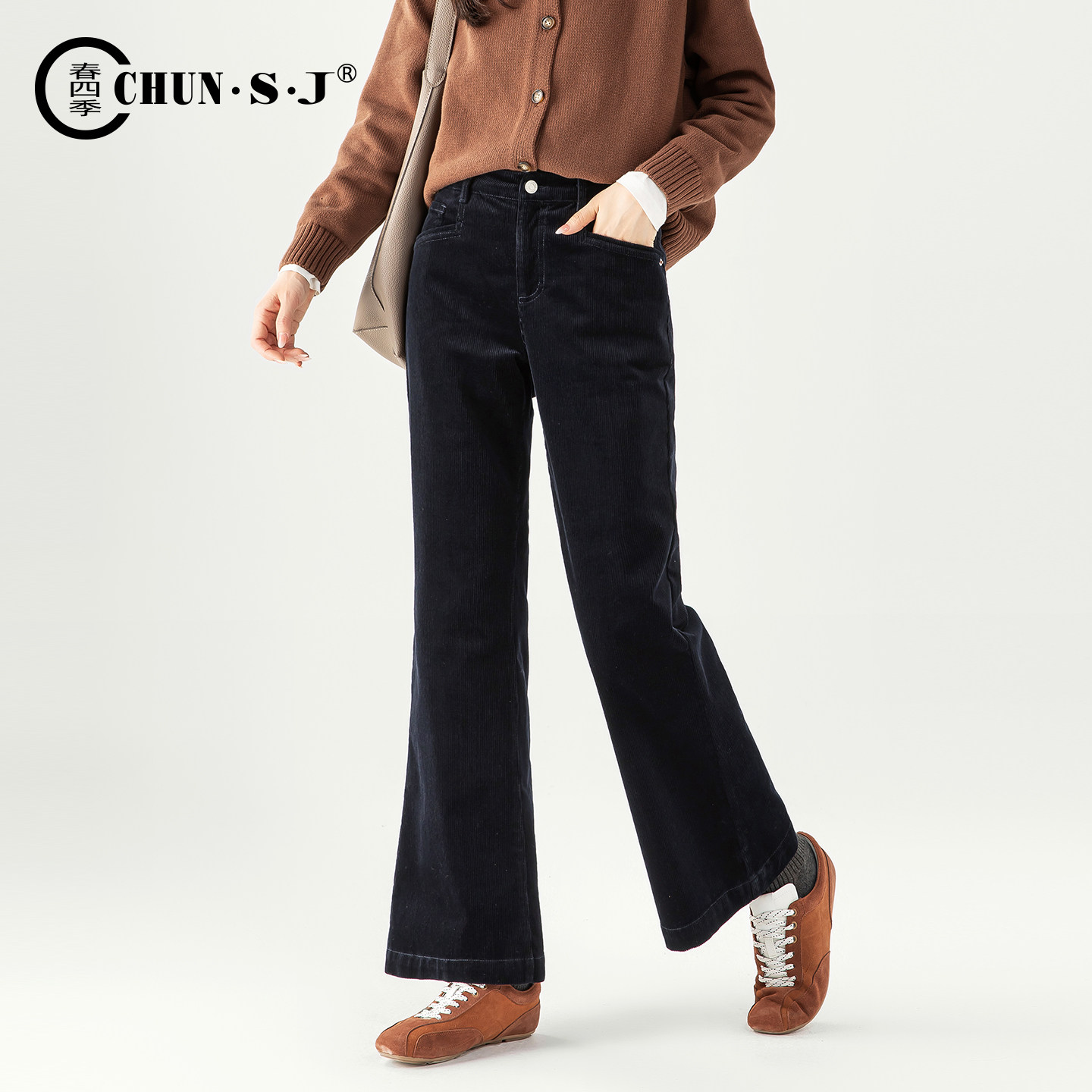 女2025新款 子喇叭裤 冬季 条绒加绒裤 藏青色女裤 小个子灯芯绒微喇裤