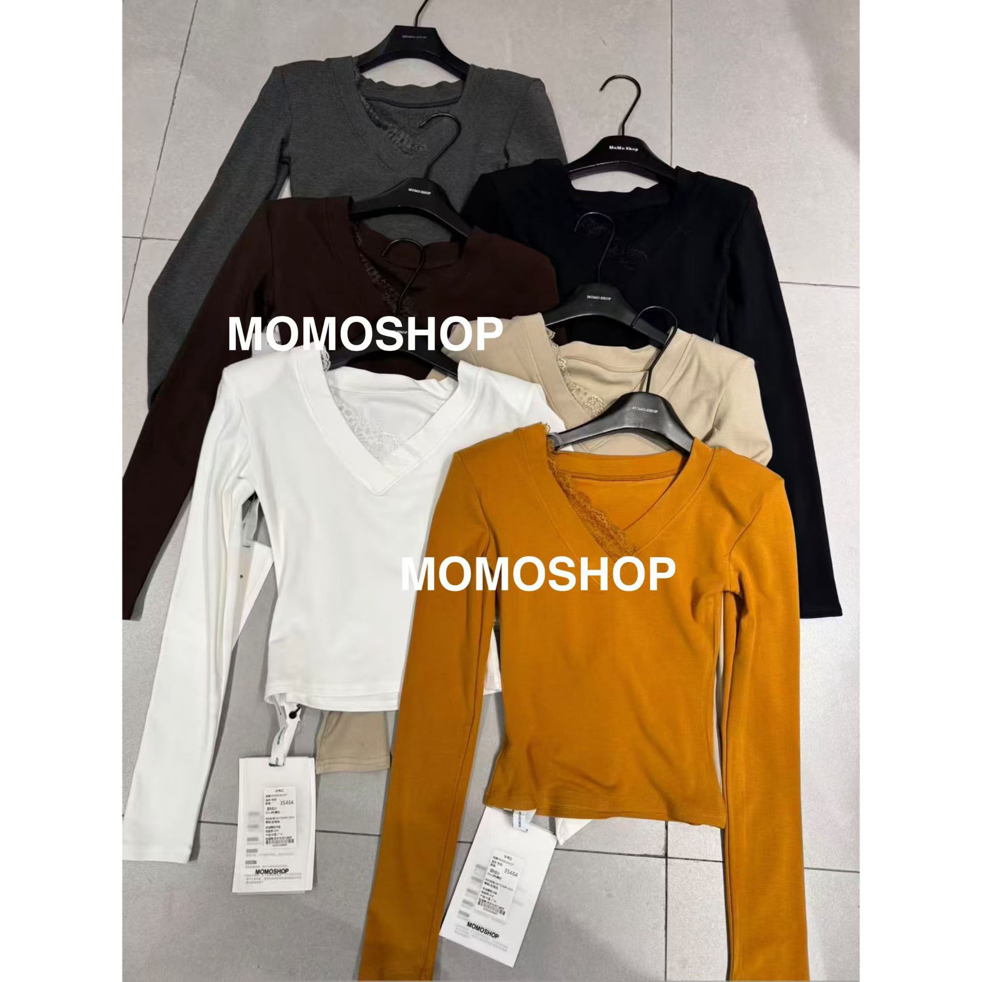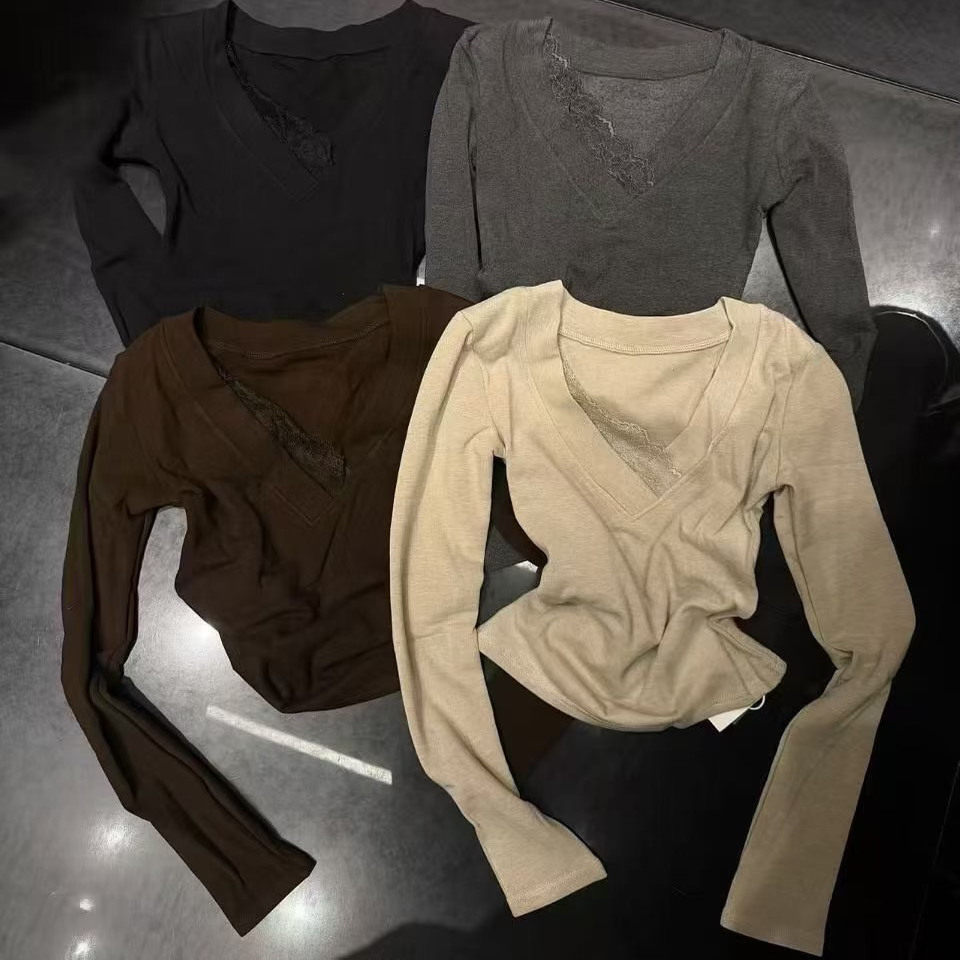 修身 打底衫 上衣女潮 t恤女2025秋冬新款 性感辣妹杏色v领蕾丝长袖