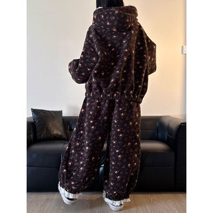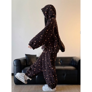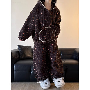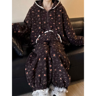 可外穿 加绒加厚家居服套装 复古碎花毛绒连帽睡衣女2025秋冬季 新款