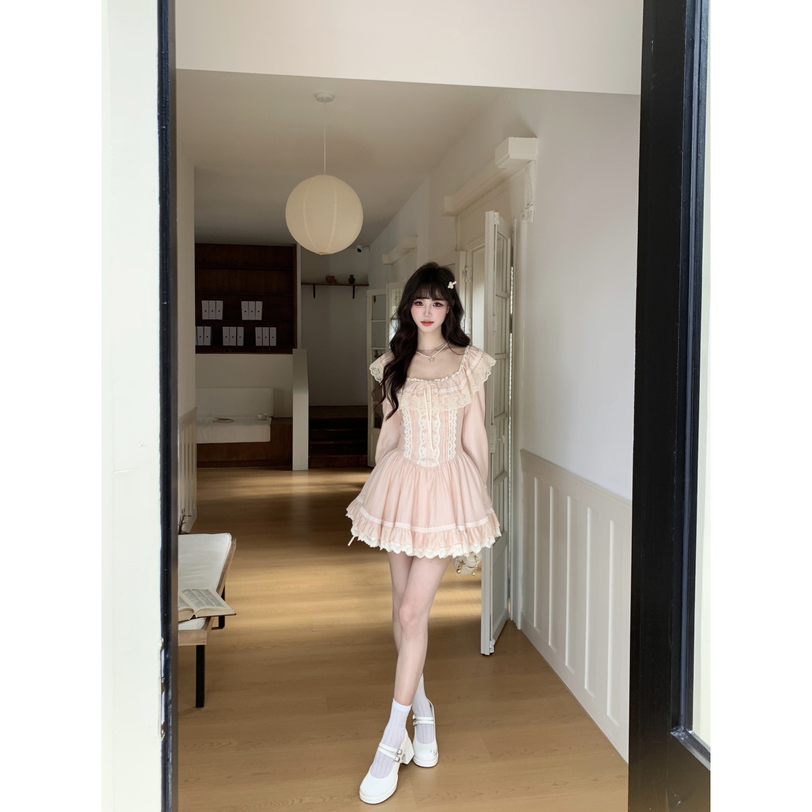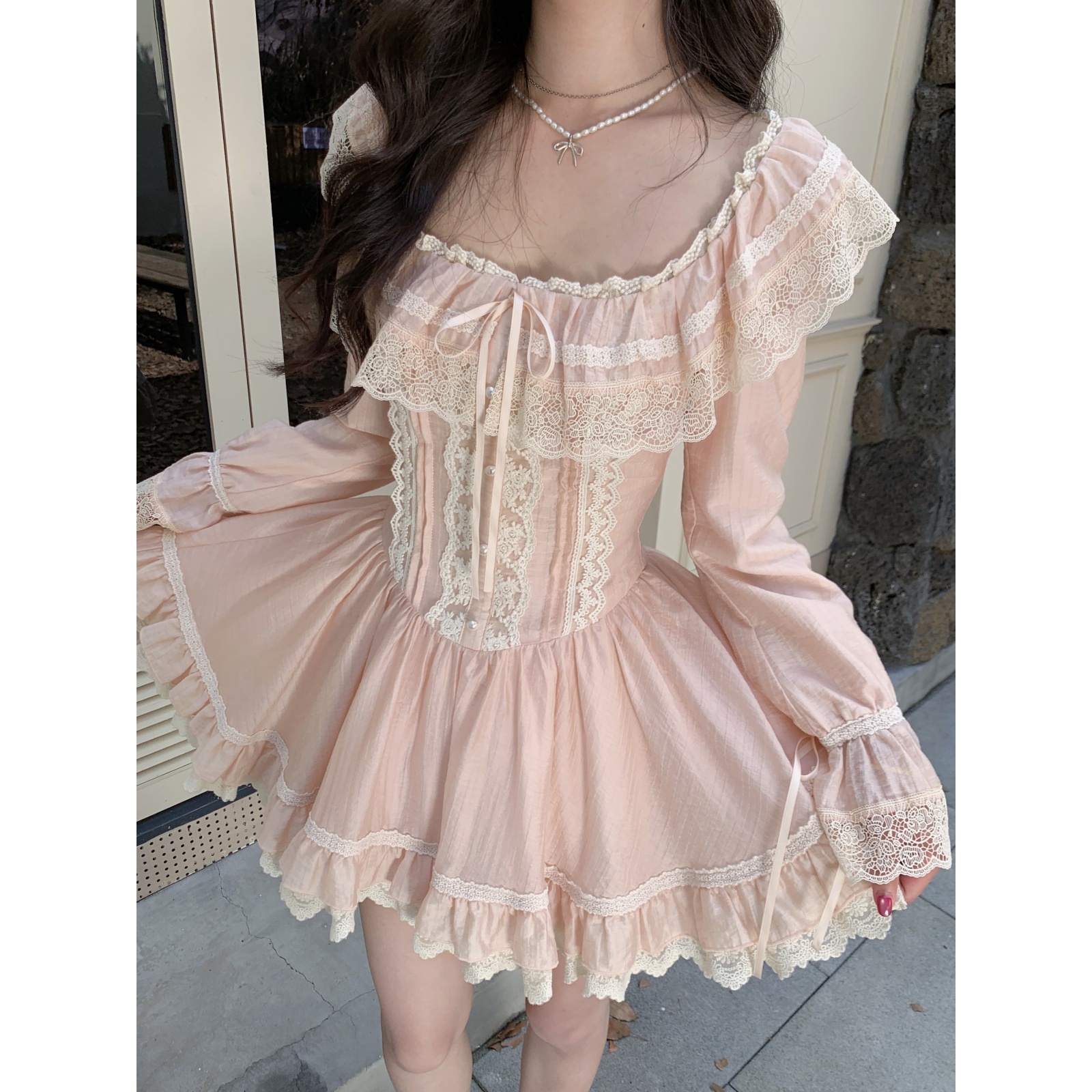 纯欲少女风重工蕾丝边收腰粉色蓬蓬连衣裙 法式 越韩小鱼 古董昭和