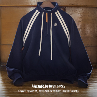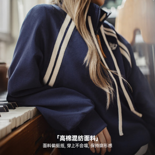 马登美式 无帽卫衣女士春 复古学院风藏青色半拉链翻高立领套头长袖