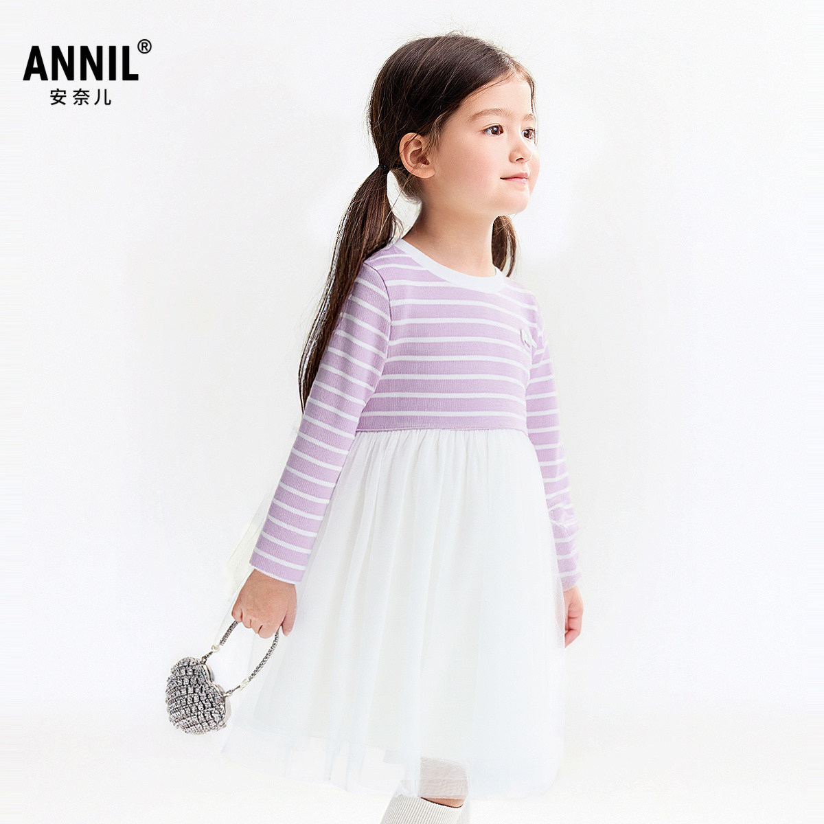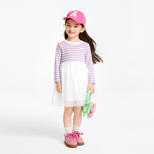 安奈儿童装 提花透气弹力条纹网纱拼接裙子 女童连衣裙2025秋新款