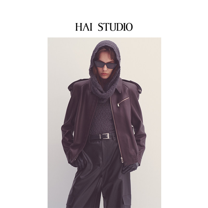 孔雪儿yigenana同款 STUDIO25秋冬弧形肩皮夹克羊皮真皮衣外套 HAI