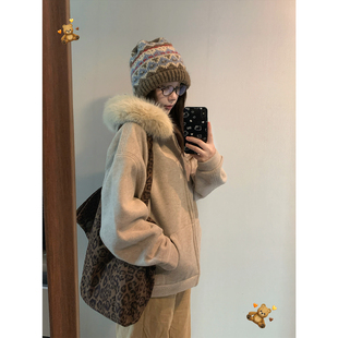 休闲卫衣开衫 SUNIRIROR 燕麦色连帽可拆卸毛领双面呢外套女秋冬季
