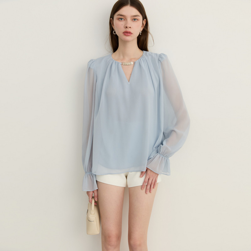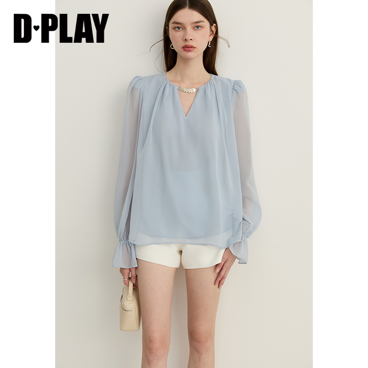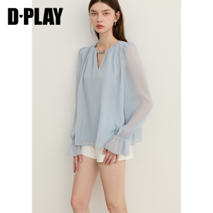 流行宽松衬衫 DPLAY2026年春季 金属链气质时尚 蓝色圆领雪纺衫 新款