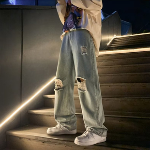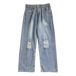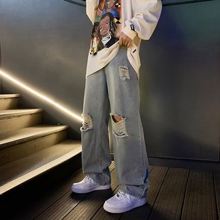 宽松百搭休闲裤 春秋季 欧美潮牌高街痞帅裤 男款 ins破洞直筒牛仔裤