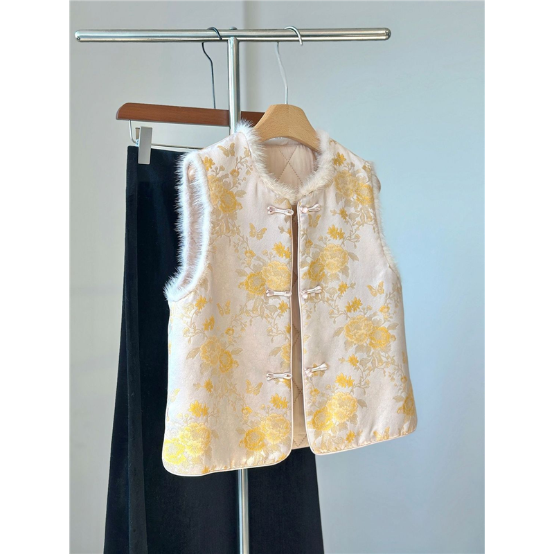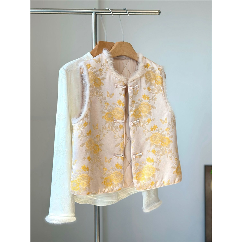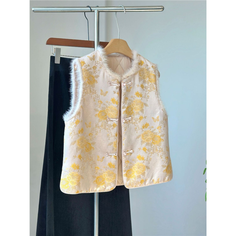 黄色显白高端新中式 背心减龄洋气拼接毛边盘扣国风夹棉外穿马甲