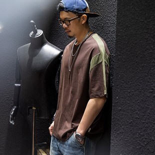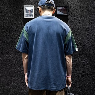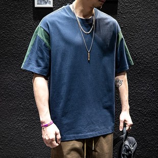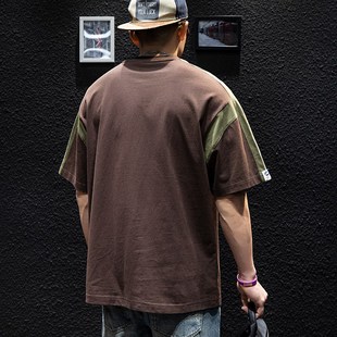 上衣男生圆领潮流体恤潮 宽松潮牌大码 复古拼接纯棉短袖 t恤男夏季