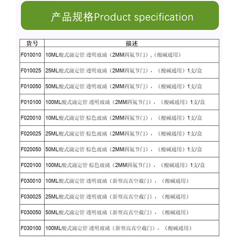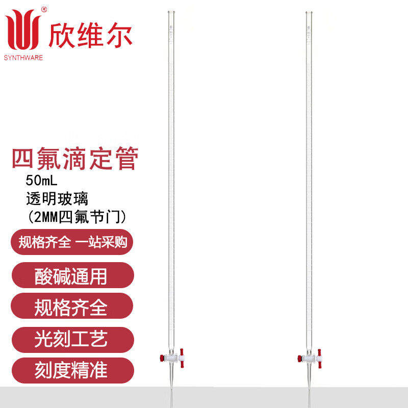 F02 F01 F03 高硼硅玻璃 欣维尔synthware四氟滴定管四氟节门酸滴管碱滴管四氟滴定管实验室量器可过检