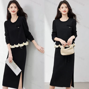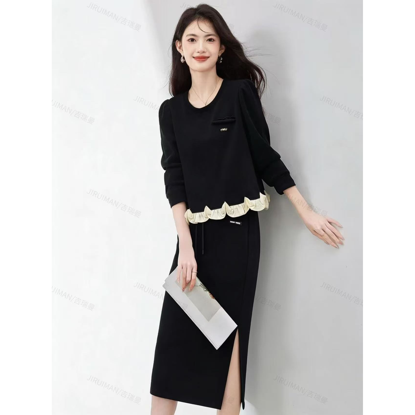 T801 千金风气质撞色上衣半身裙两件套套裙MAN 春秋款