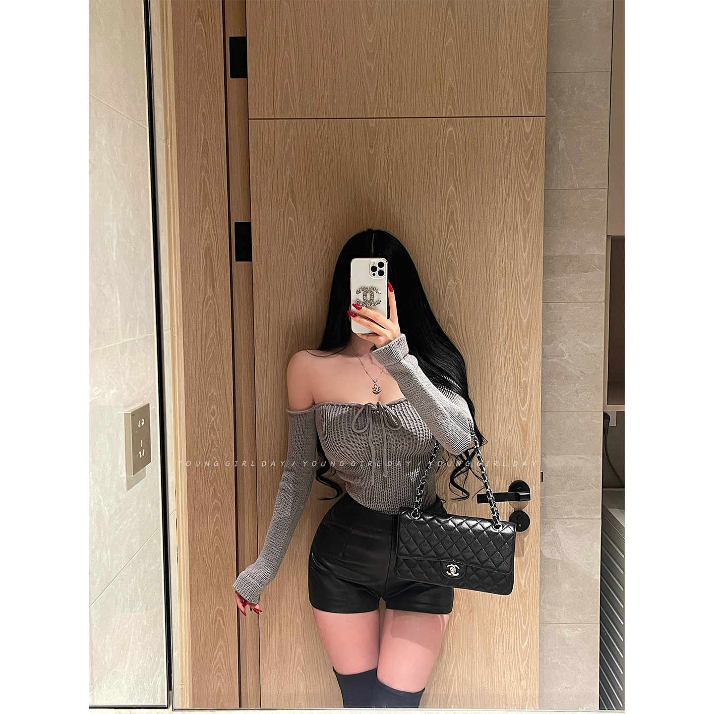 YoungGirlDay纯欲辣妹性感露肩抹胸蝴蝶结系带长袖 上衣 打底针织衫