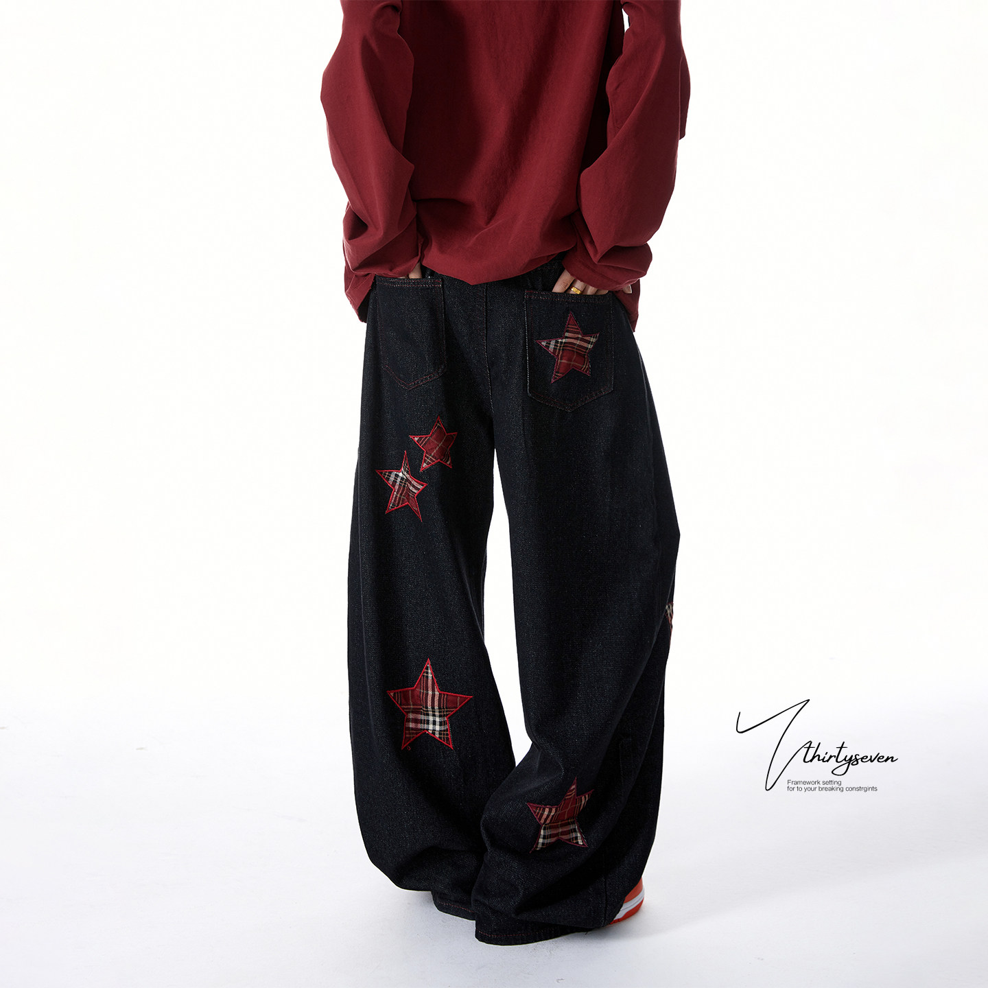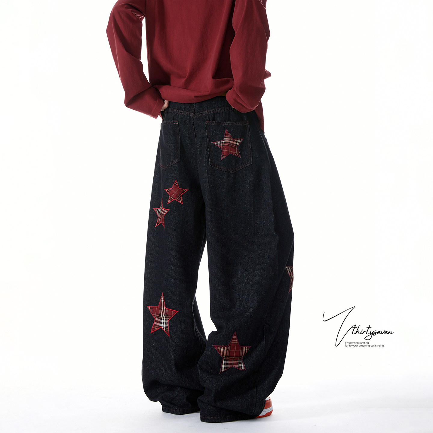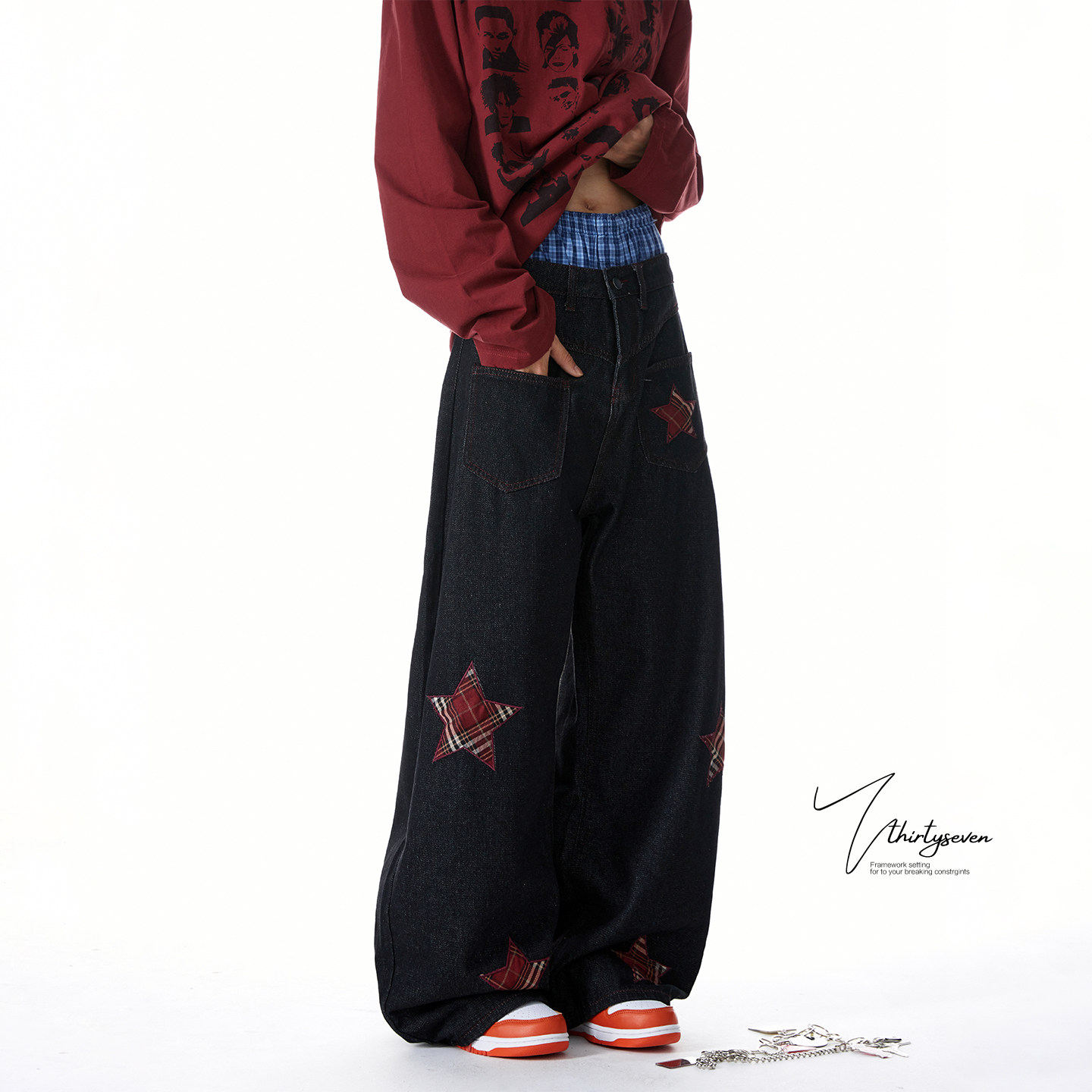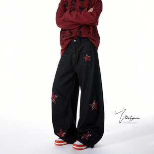 子 男潮牌hiphop高街宽松休闲裤 V37美式 格子星星贴布绣牛仔弯刀裤