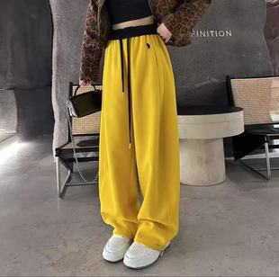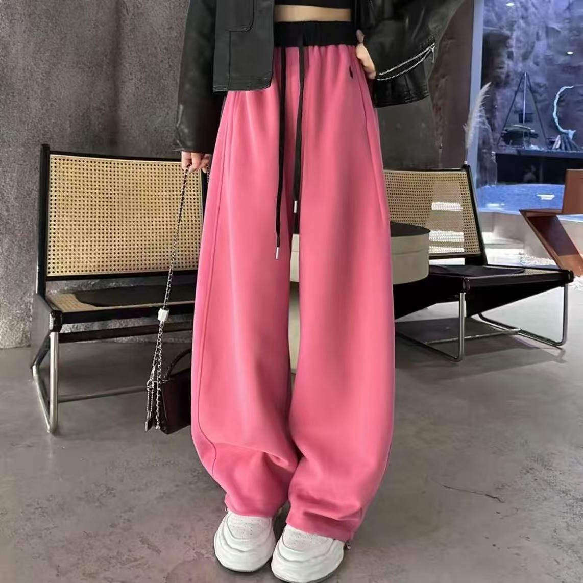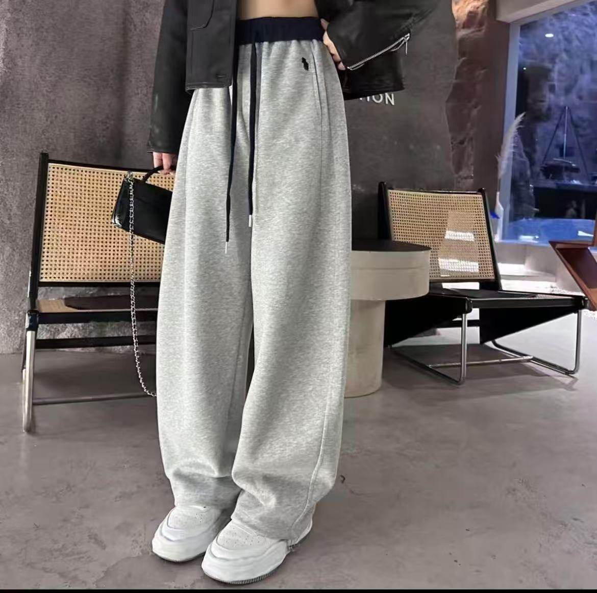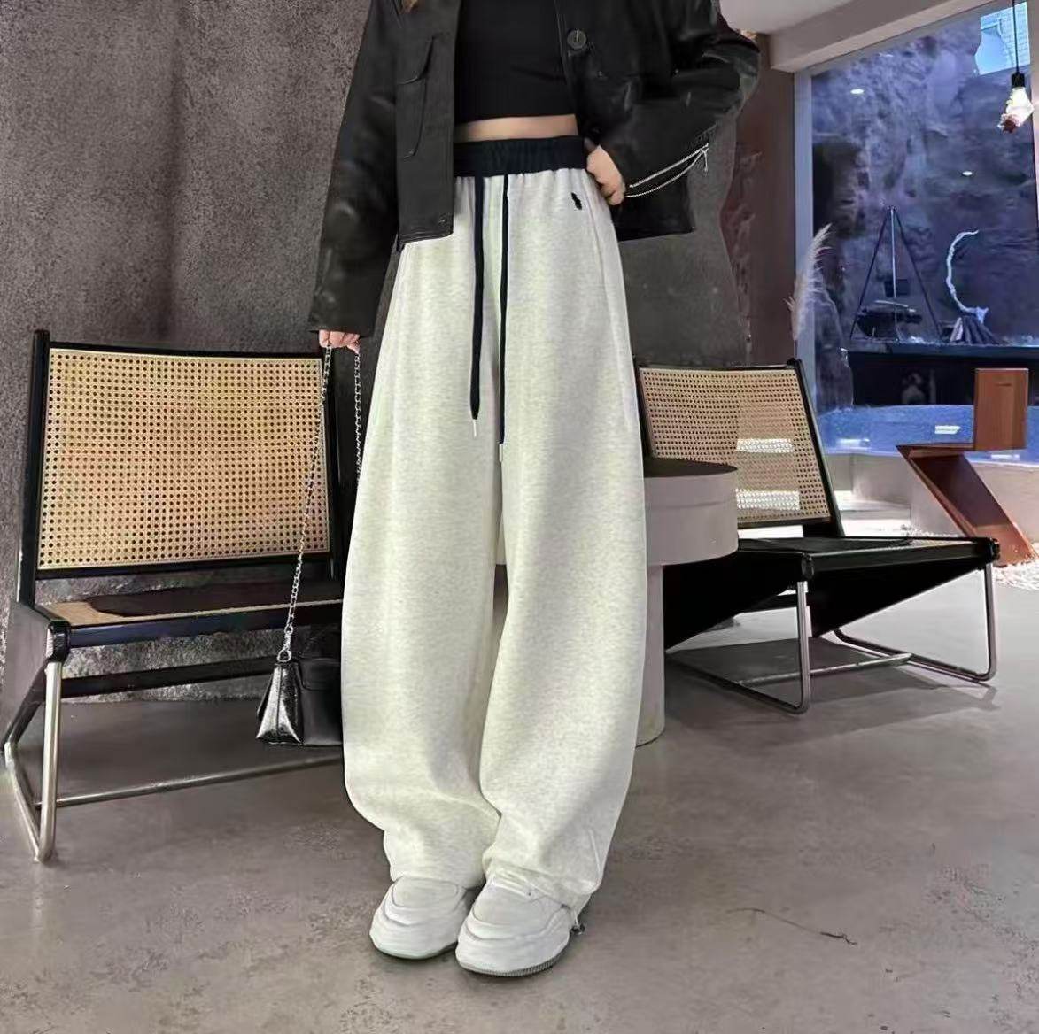 宽松高腰加绒阔腿拖地裤 女新款 T货架东 撞色弯刀卫裤 加绒加厚时尚