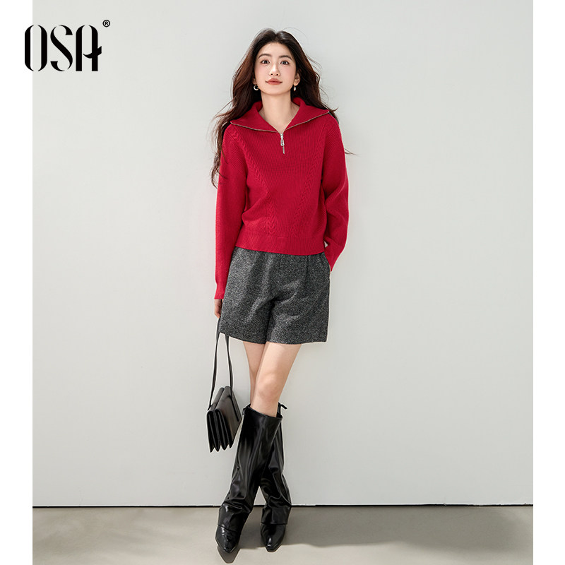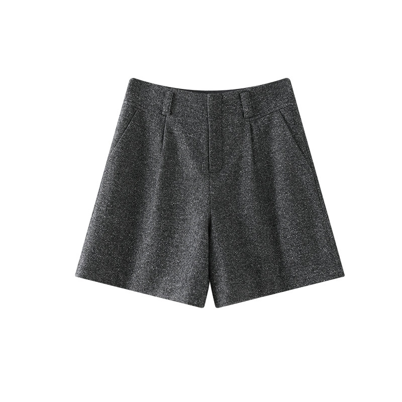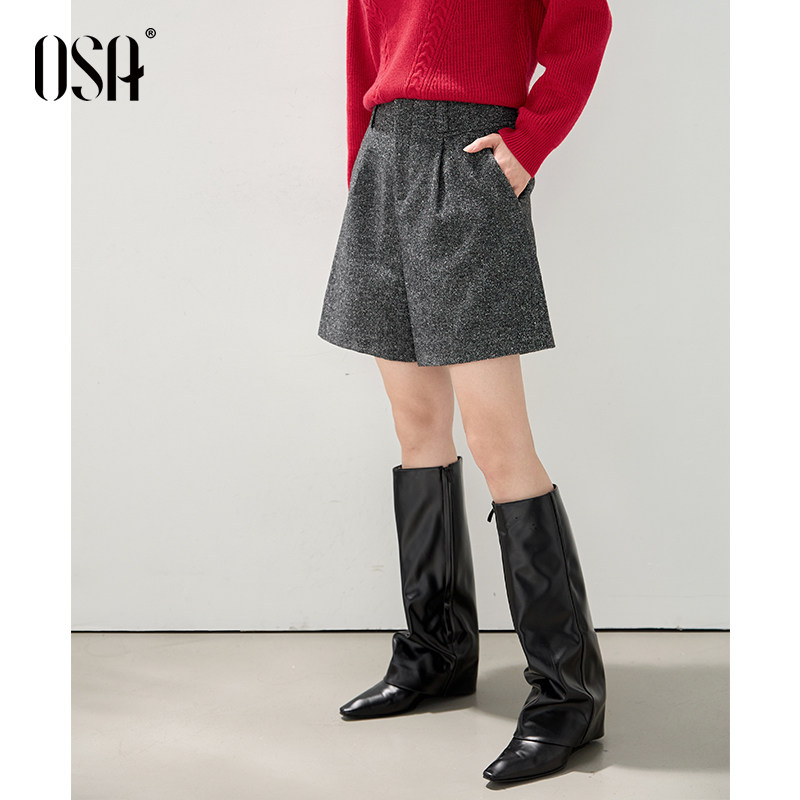 五分裤 OSA欧莎灰色人字纹毛呢短裤 休闲直筒中裤 新款 女2025年冬季
