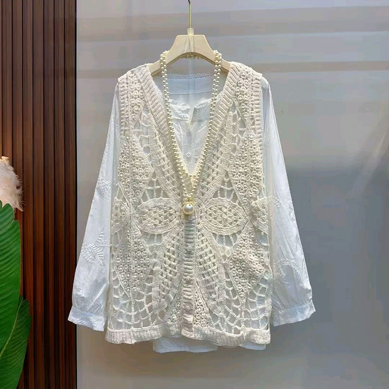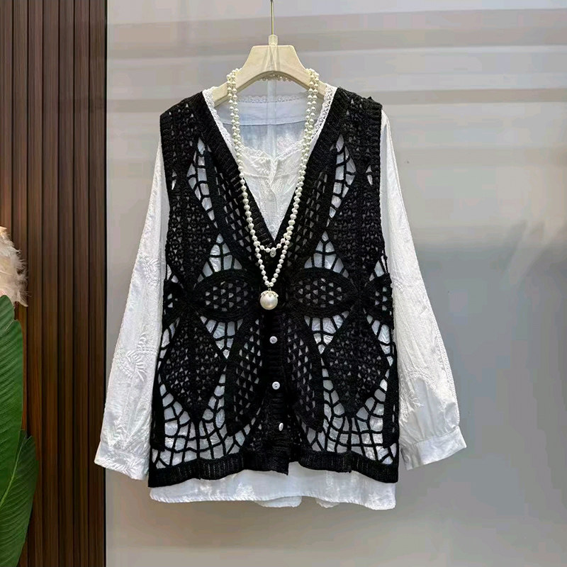 镂空勾花针织马甲大码 开衫 女装 胖mm百搭打底长袖 秋季 衬衫 爆款