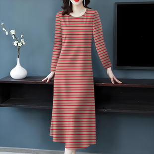 休闲慵懒风长款 新款 宽松显瘦长裙子 连衣裙女秋季 复古气质条纹长袖