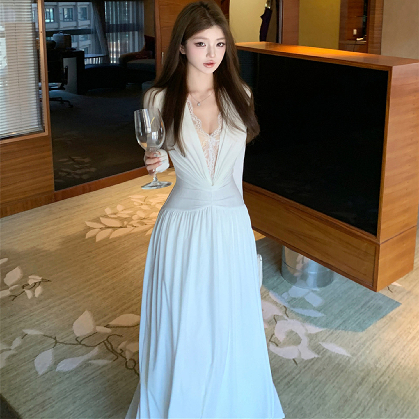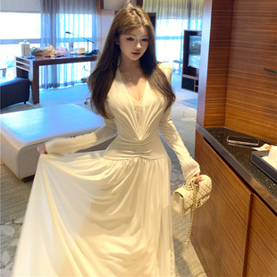 收腰裙子设计感气质长裙 修身 蕾丝拼接纯欲风v领长袖 连衣裙女秋季