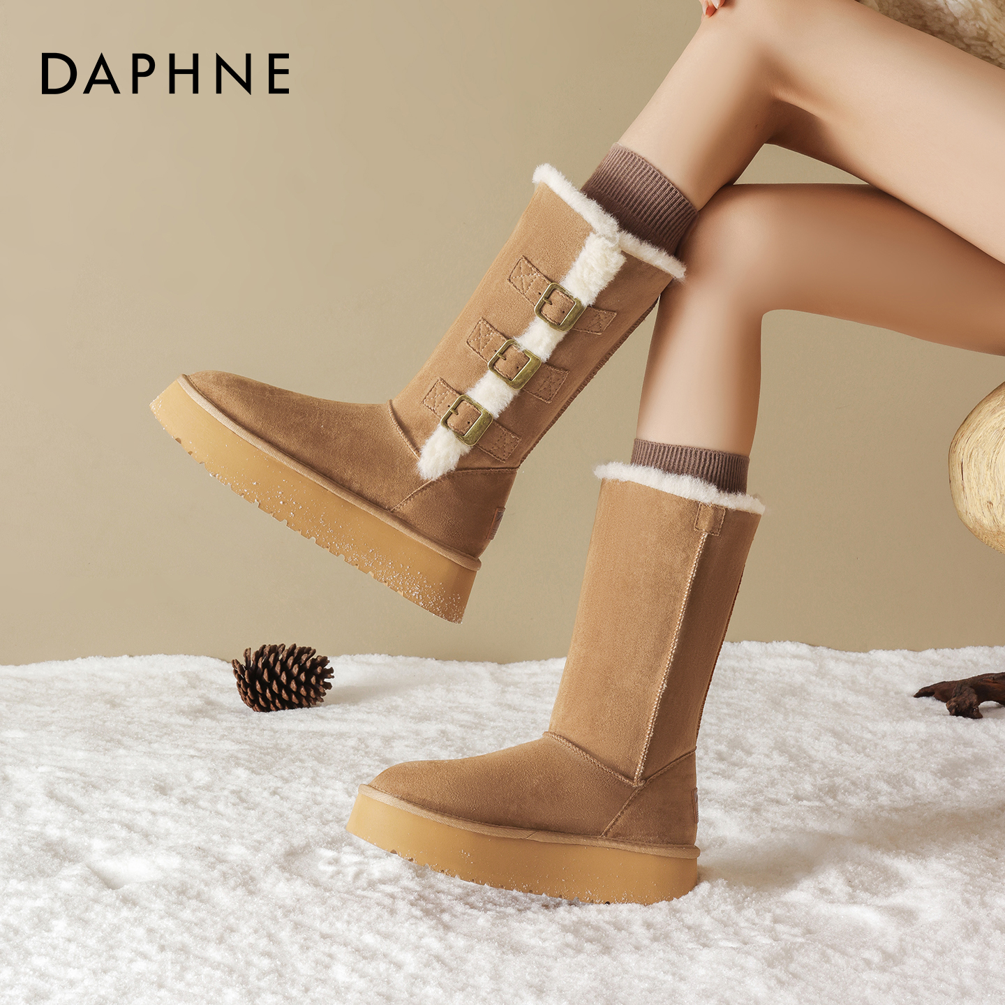防寒毛毛长筒靴 中筒加绒保暖棉鞋 达芙妮厚底雪地靴女2025冬季 新款