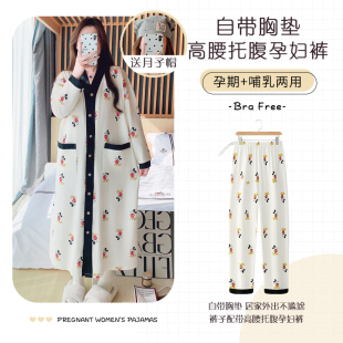 纯棉待产后喂奶中长哺乳睡裙月子服孕妇托腹裤 带胸垫春秋夏季 薄款