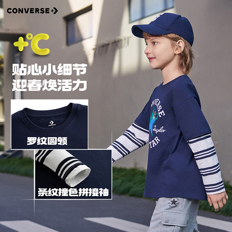 新款 T恤2026春季 假两件条纹拼接复古英伦风休闲 男童长袖 匡威童装