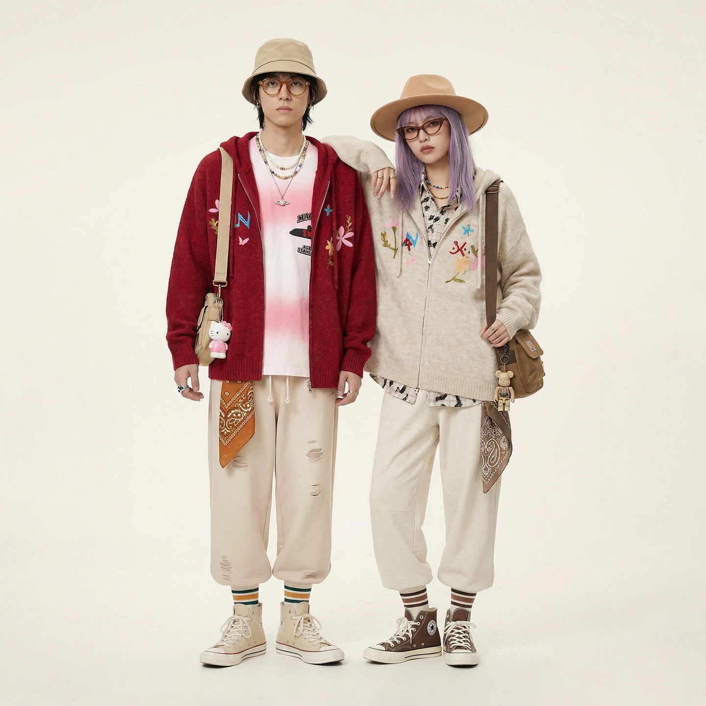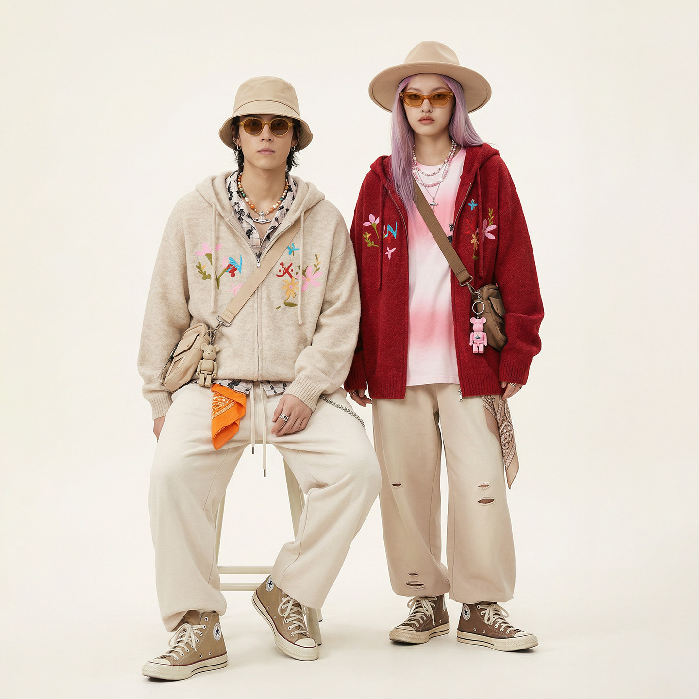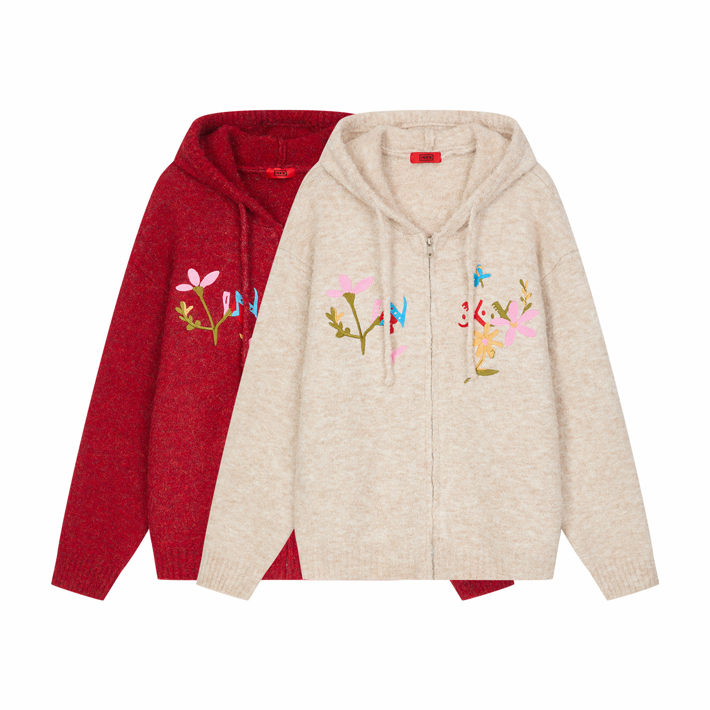 情侣花朵刺绣上衣男女同款 连帽针织开衫 新年毛衣新款 INXX明星同款