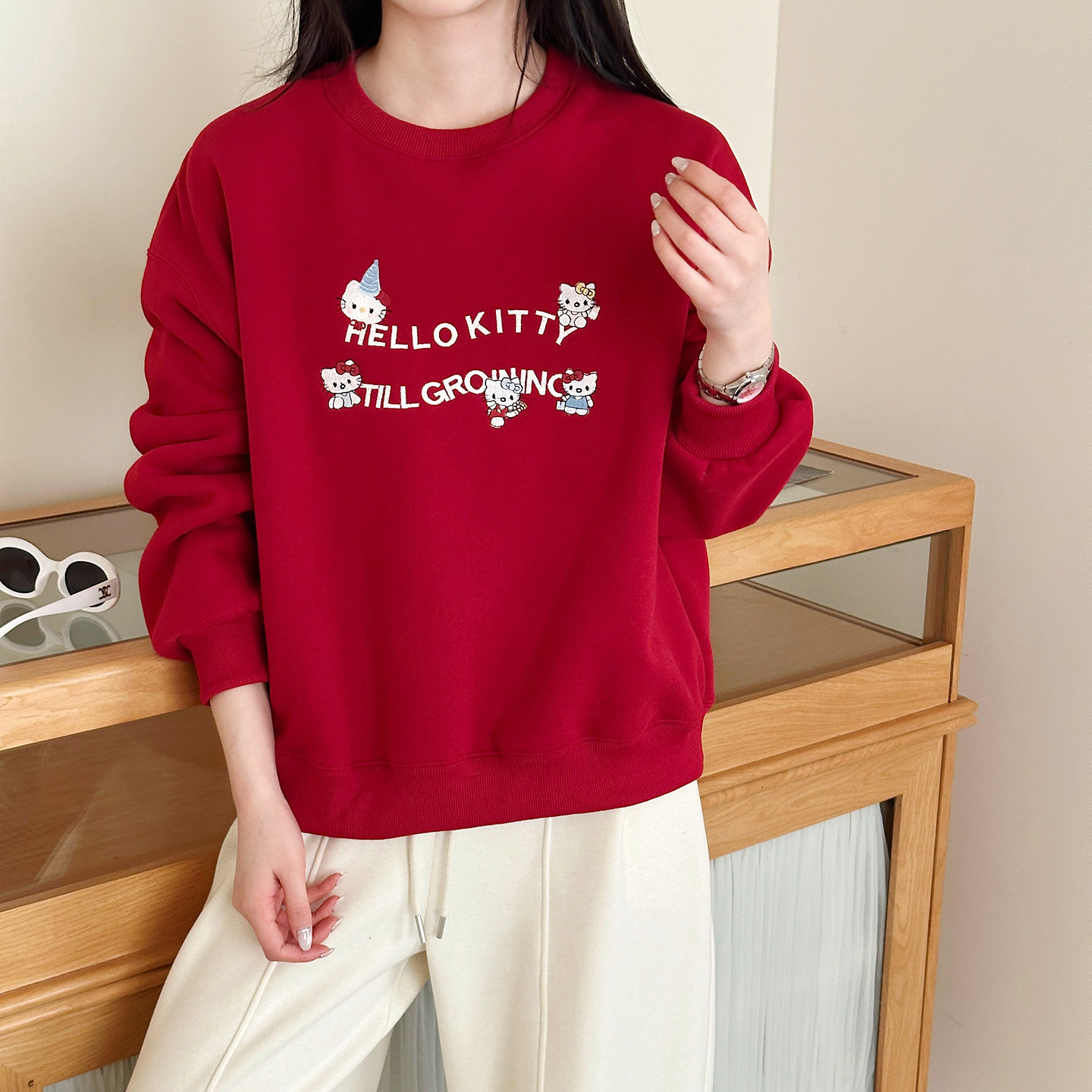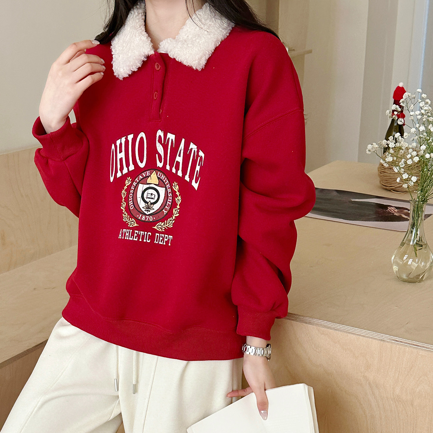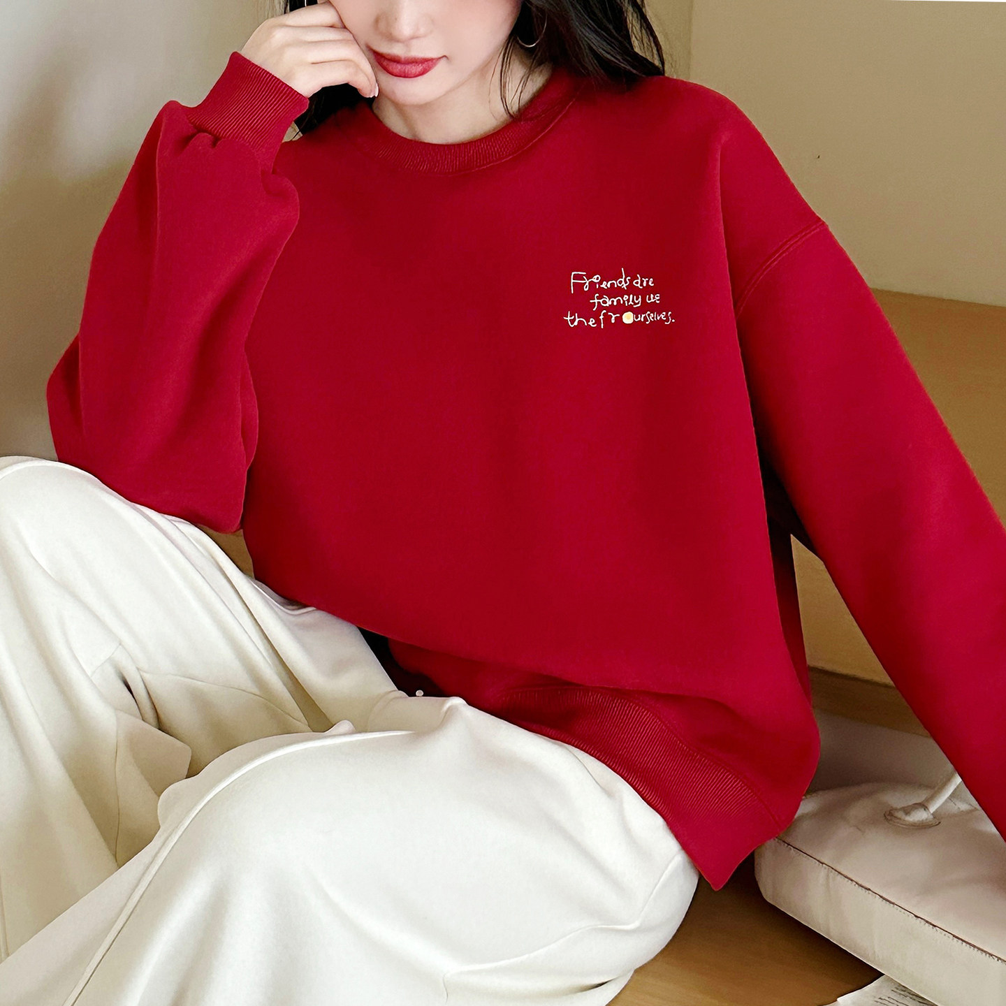 翻领卫衣2025冬款 刺绣翻领 休闲加绒女上衣 圣诞新年红 糖安妮