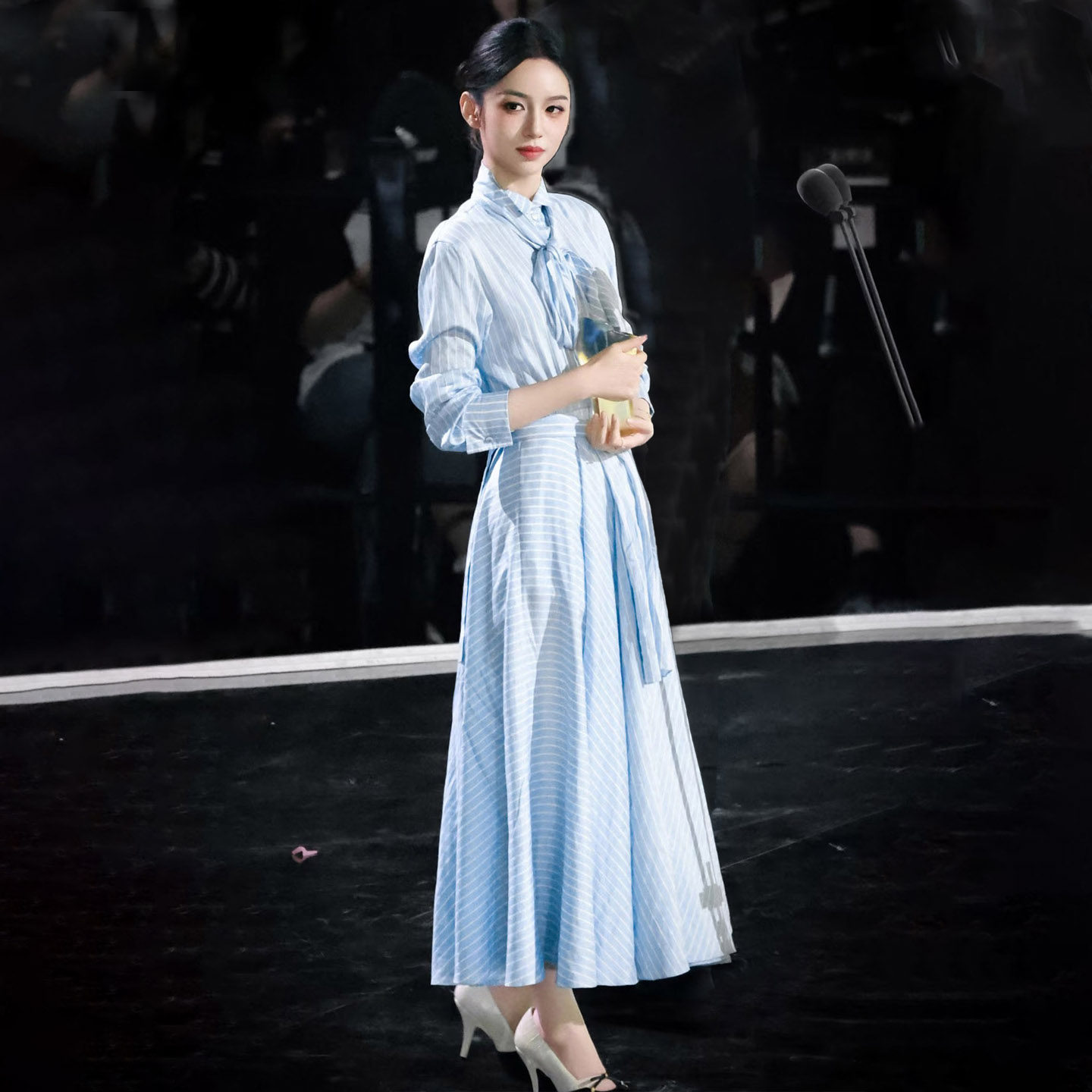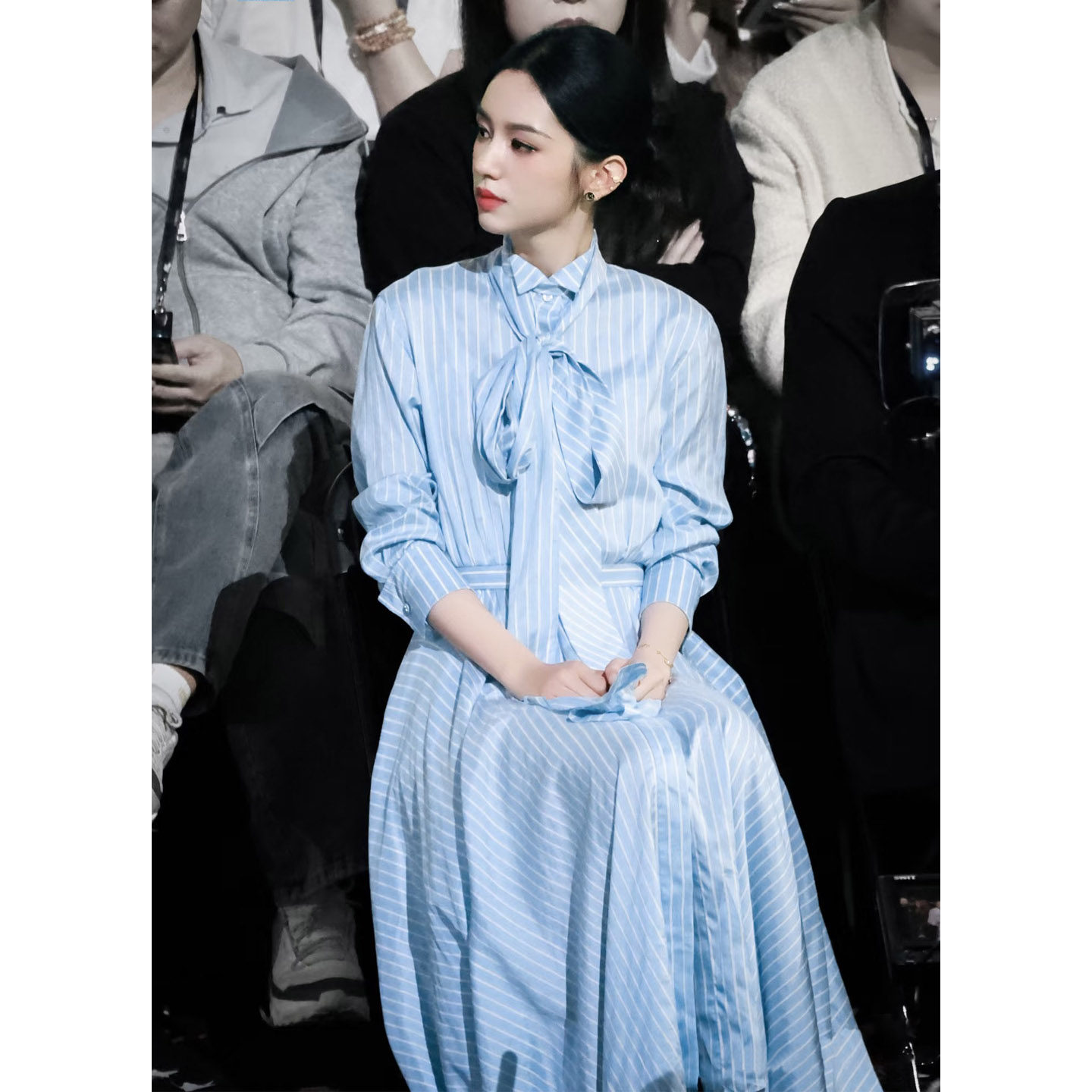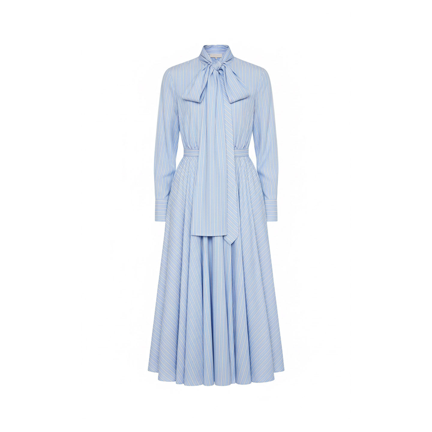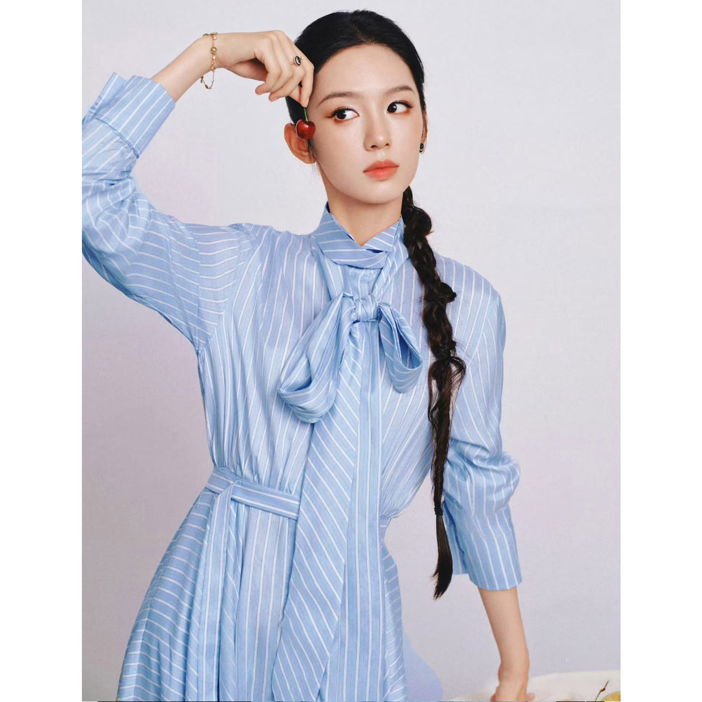 长裙 蓝色条纹蝴蝶结连衣裙女2026春气质收腰显瘦衬衫 周也同款 法式