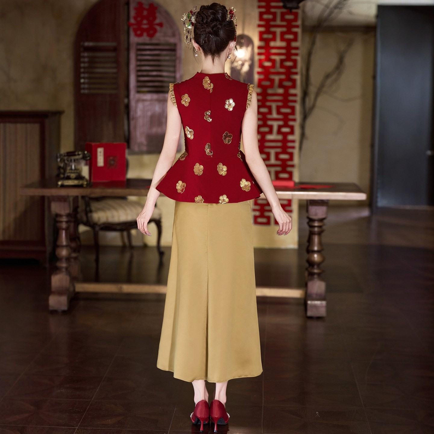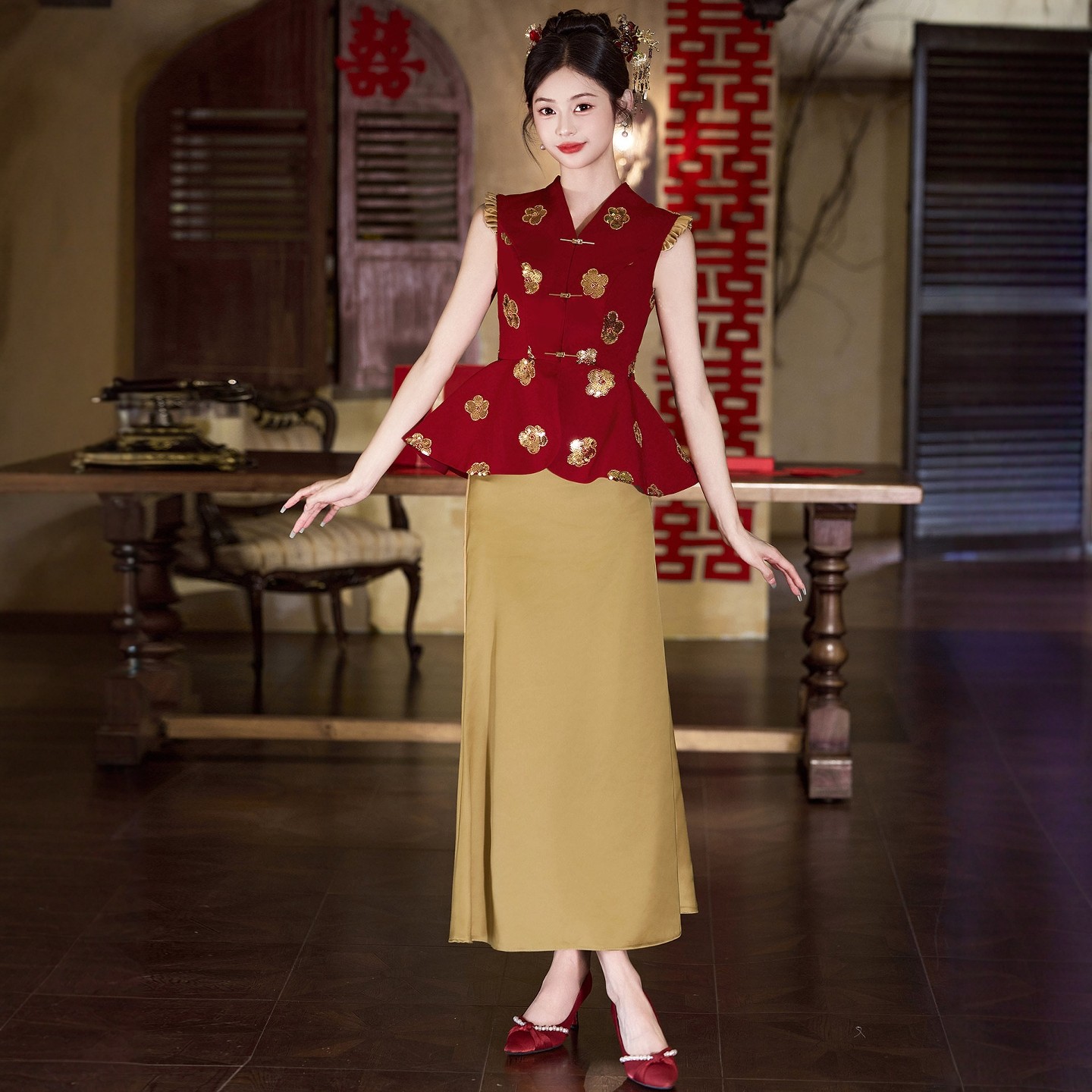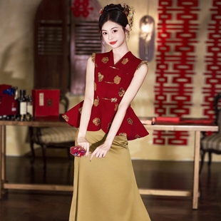 婚宴礼服套装 加厚保暖妈妈改良旗袍两件套连衣裙 裙女2025秋冬新款