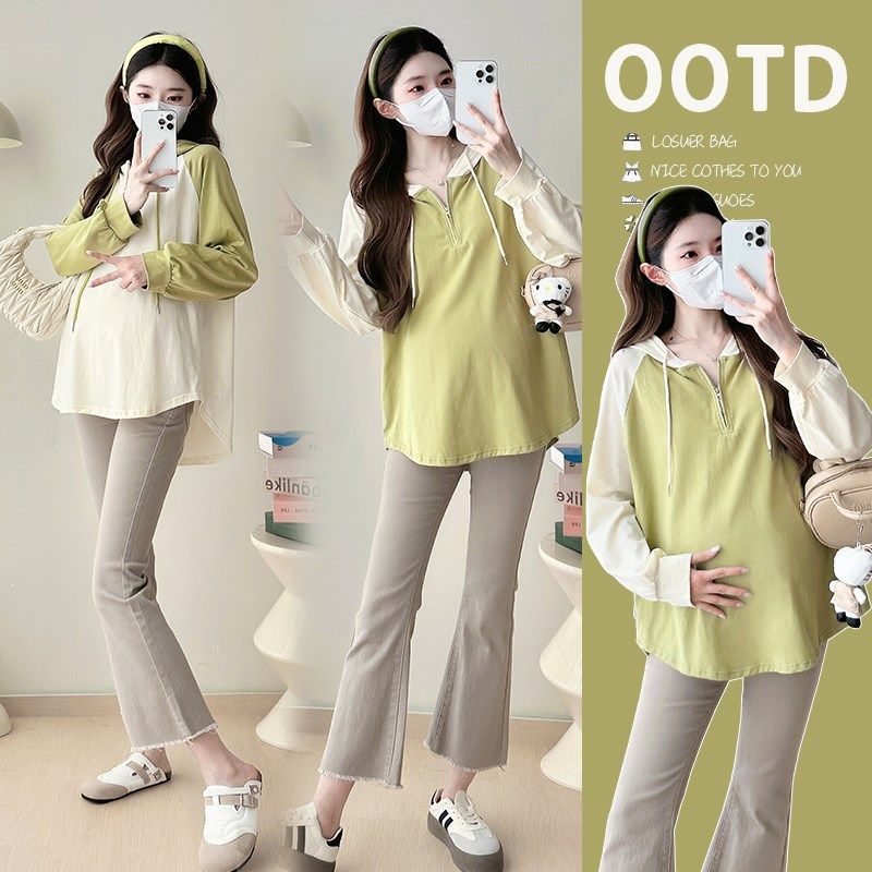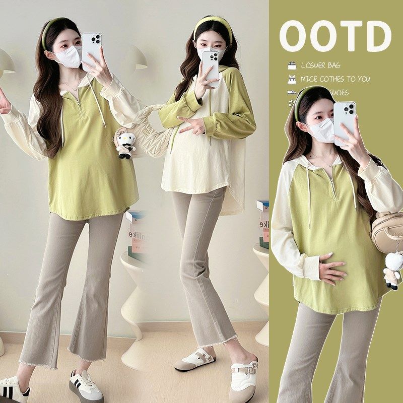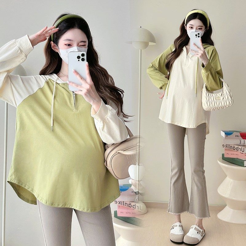 春装 孕妇T恤春季 时尚 上衣2025新款 怀孕衣服春 拼色连帽长袖 孕妇装