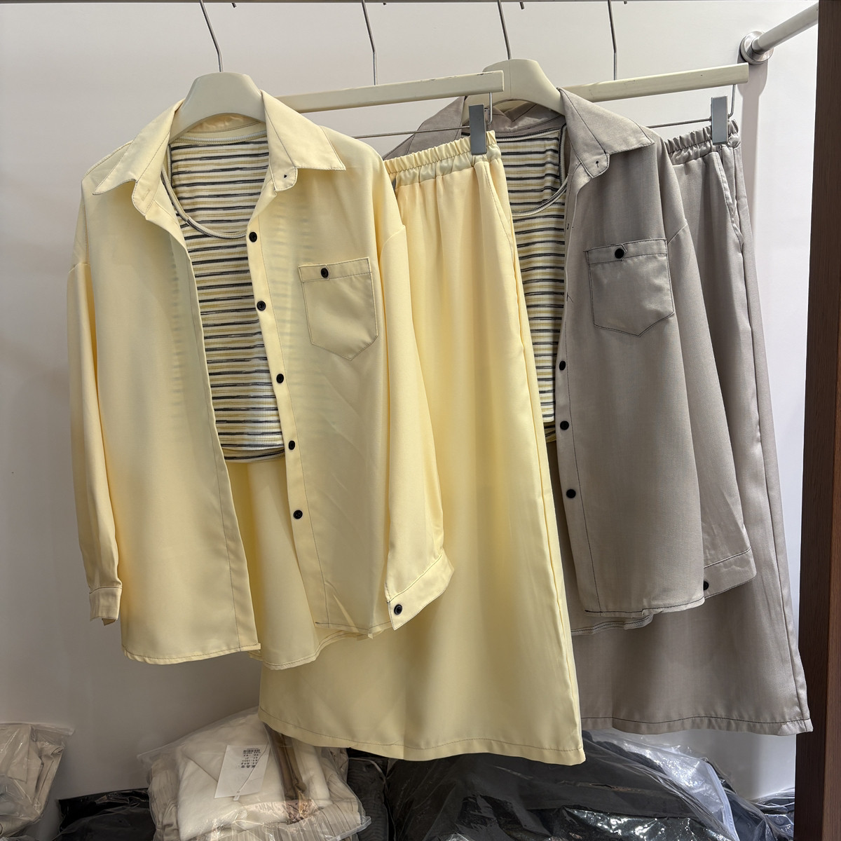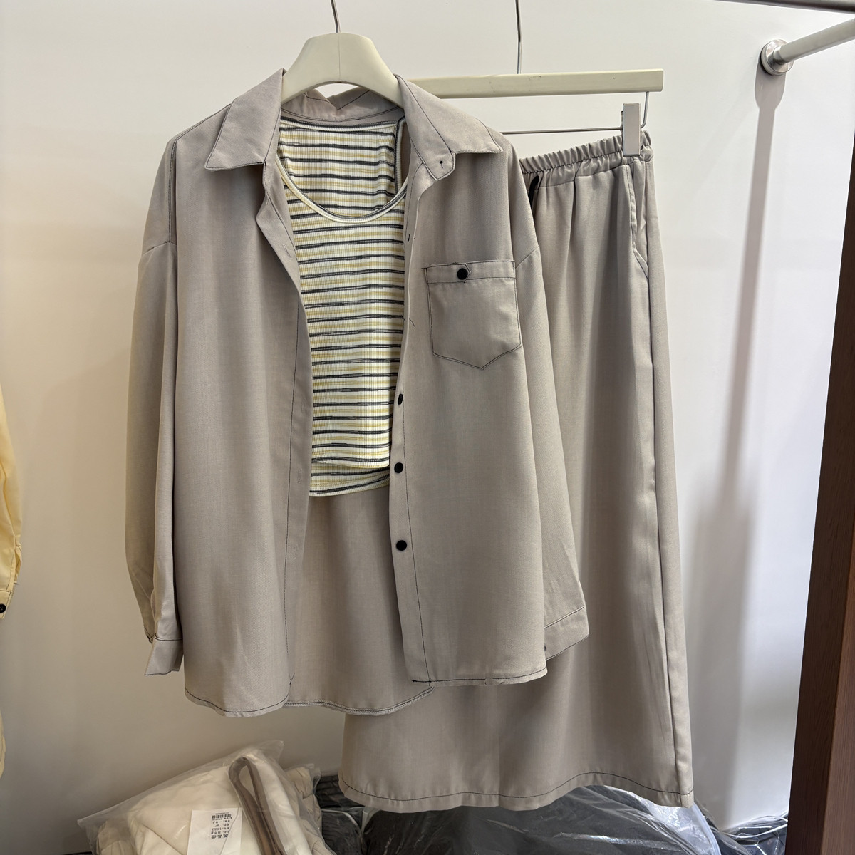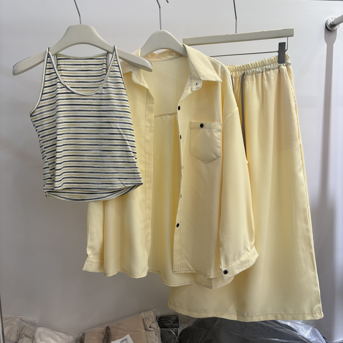 抽绳松紧腰半身裙三件套套装 条纹背心 F8809 感休闲百搭衬衫 简优