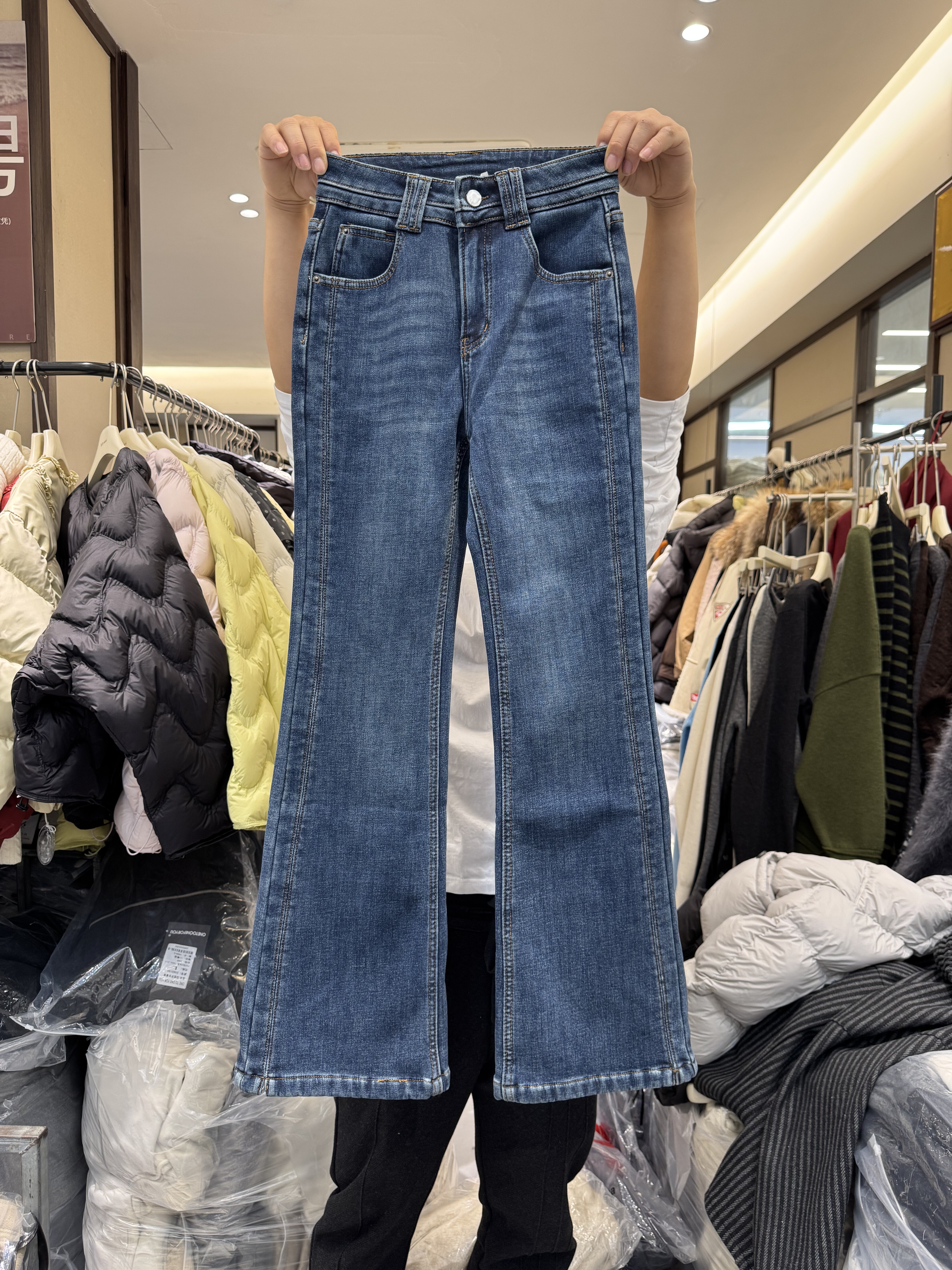 显瘦 棉质舒暖御寒 内里颗粒绒 半松紧腰直筒牛仔裤 刚需神裤