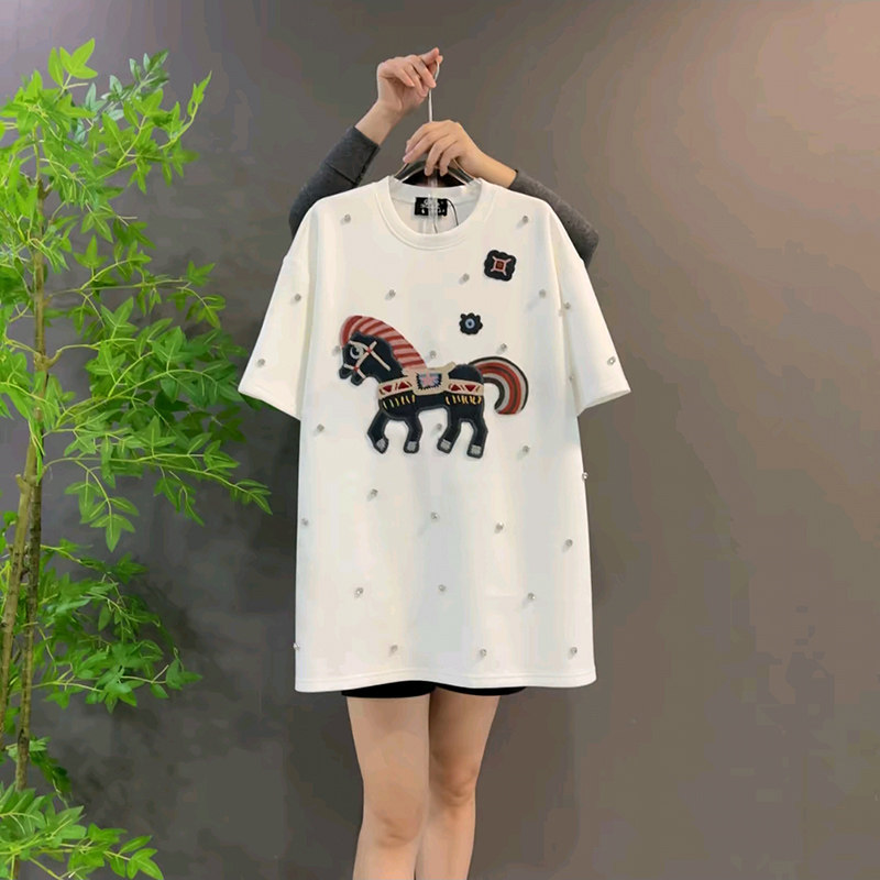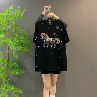胖mm圆领休闲百搭短袖 新款 T恤中长款 镶钻贴布小马大码 上衣女 韩版