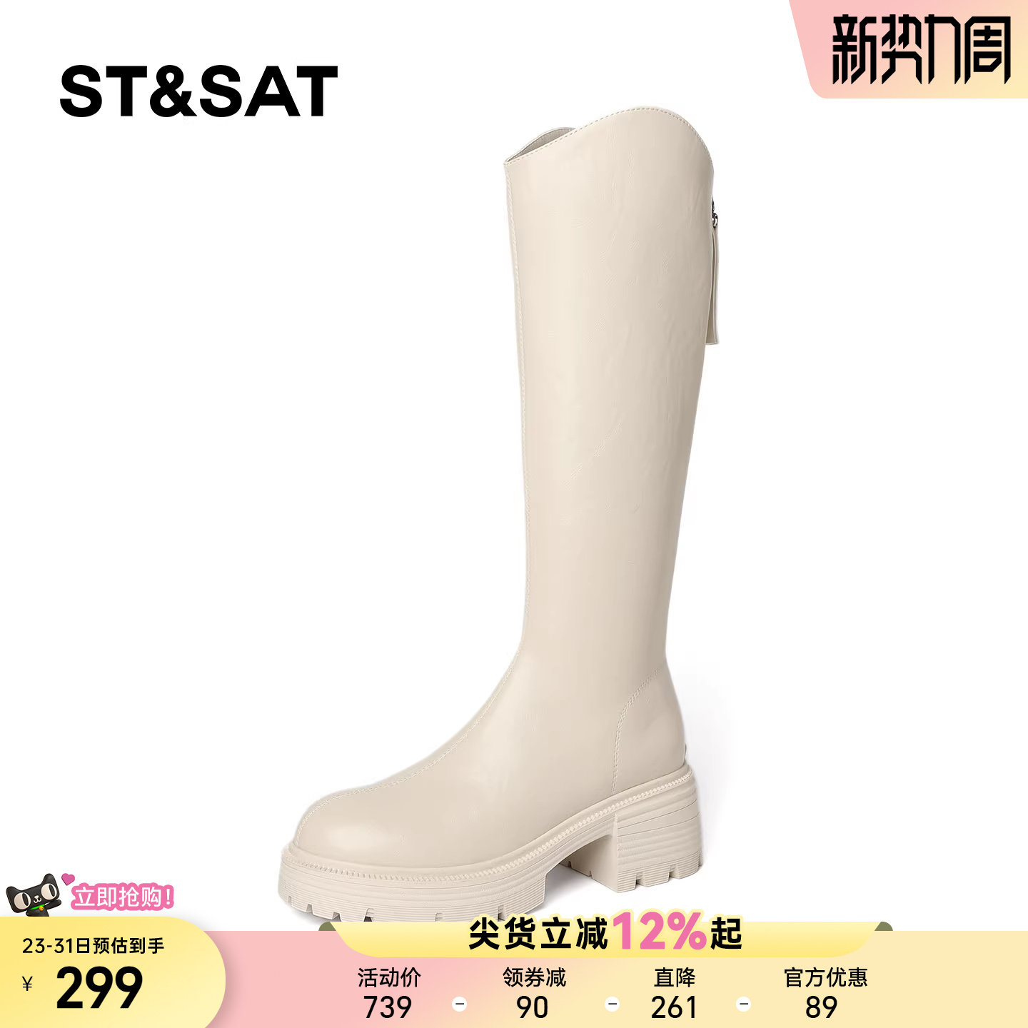 星期六白色长靴女2025新款 春后拉链高筒靴子厚底显瘦不过膝长筒靴
