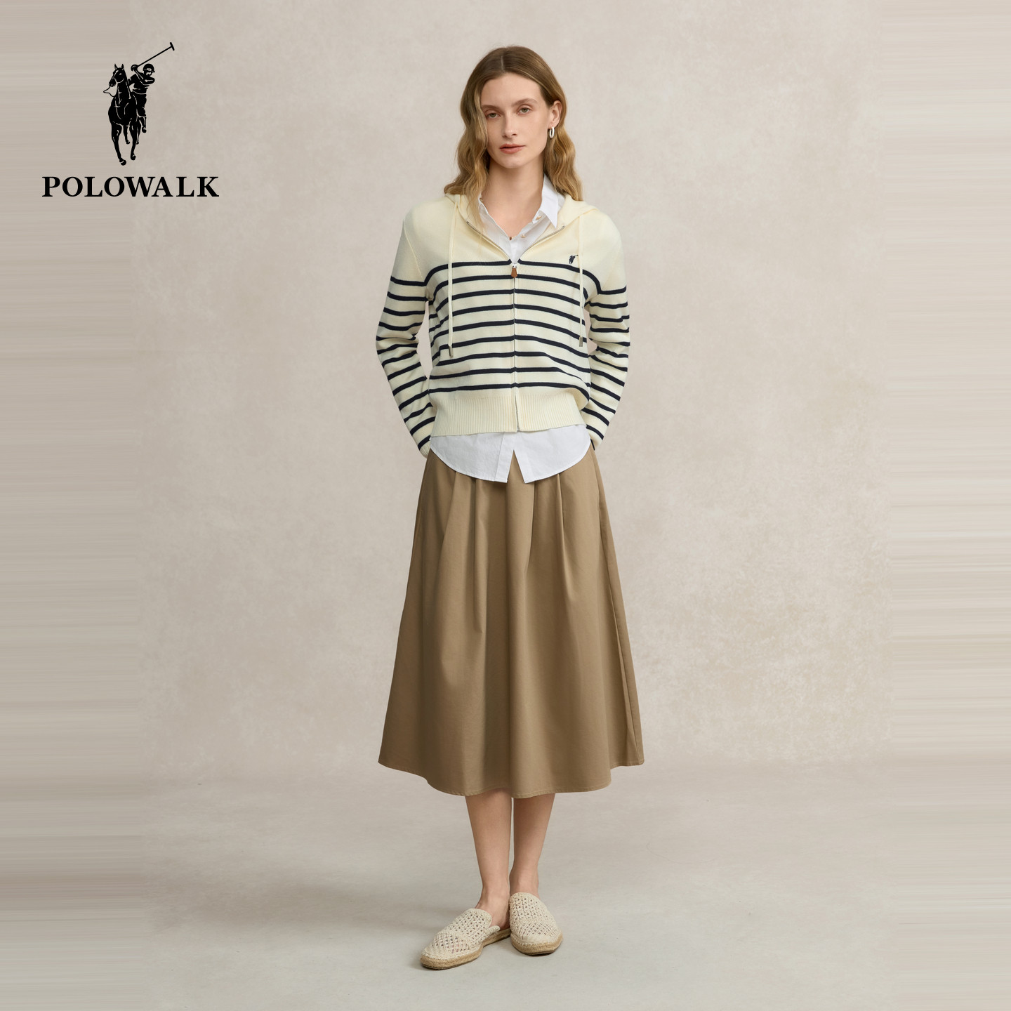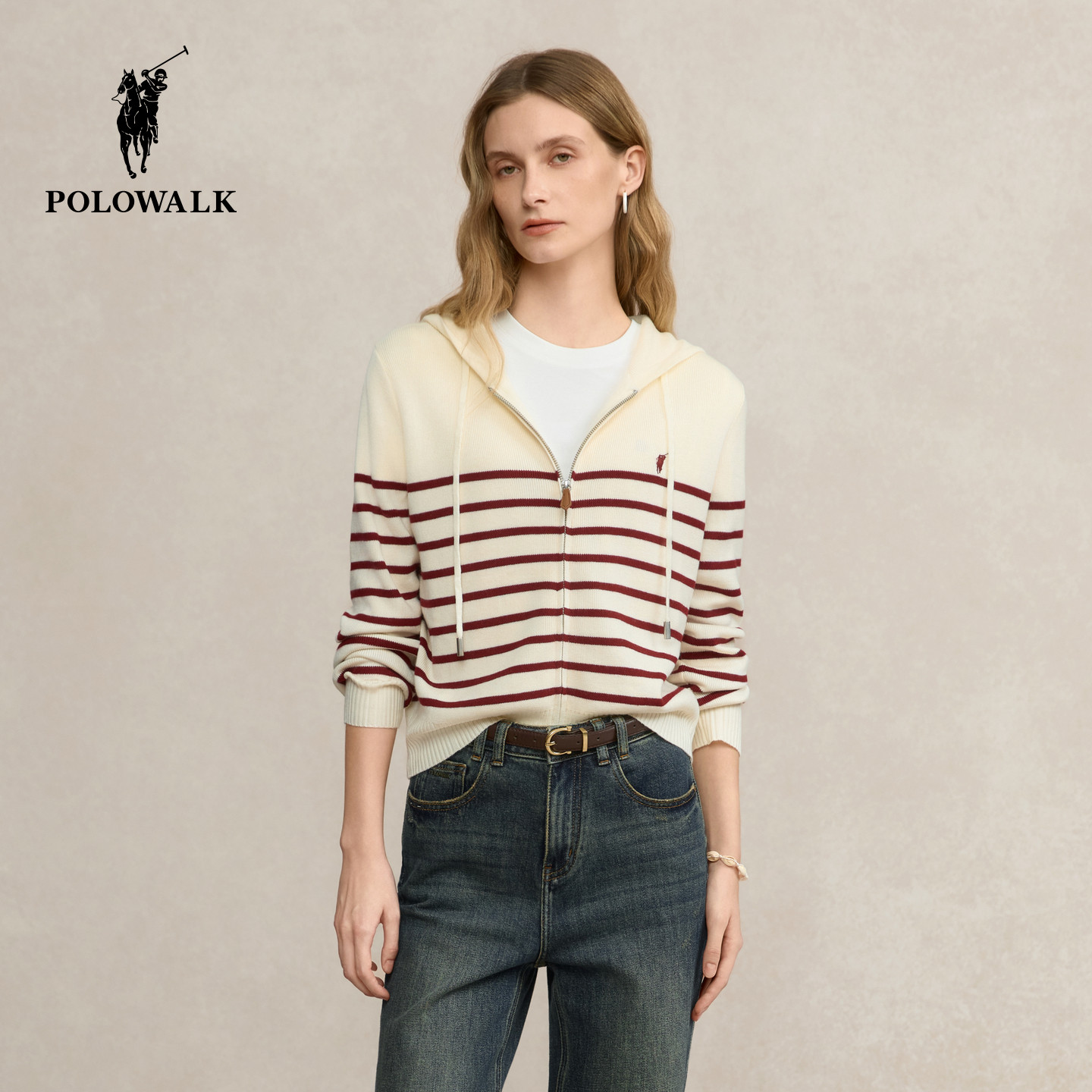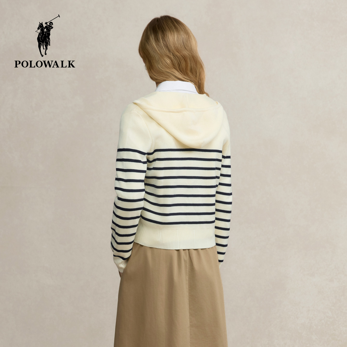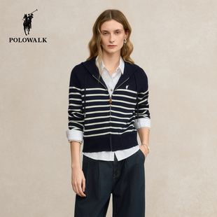 长袖 撞色条纹通勤连帽针织开衫 针织衫 新品 女 2025秋季 POLOWALK女式