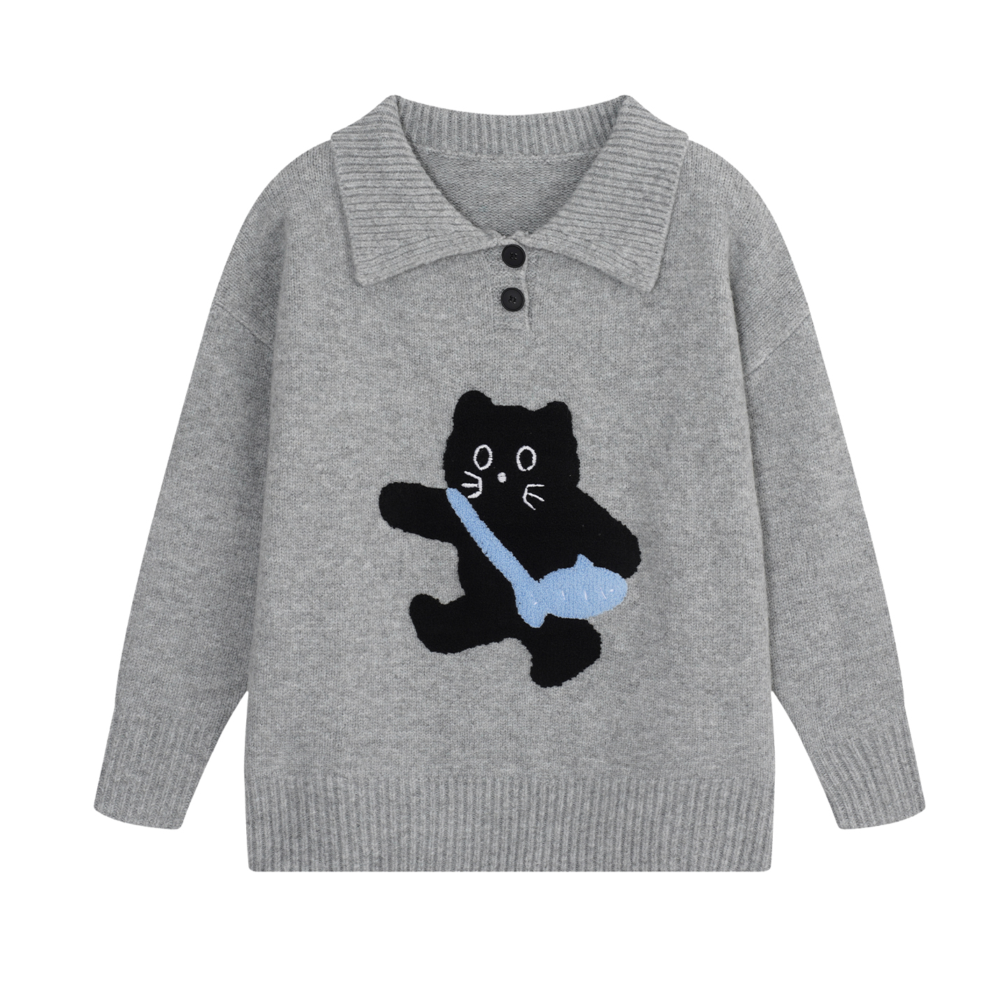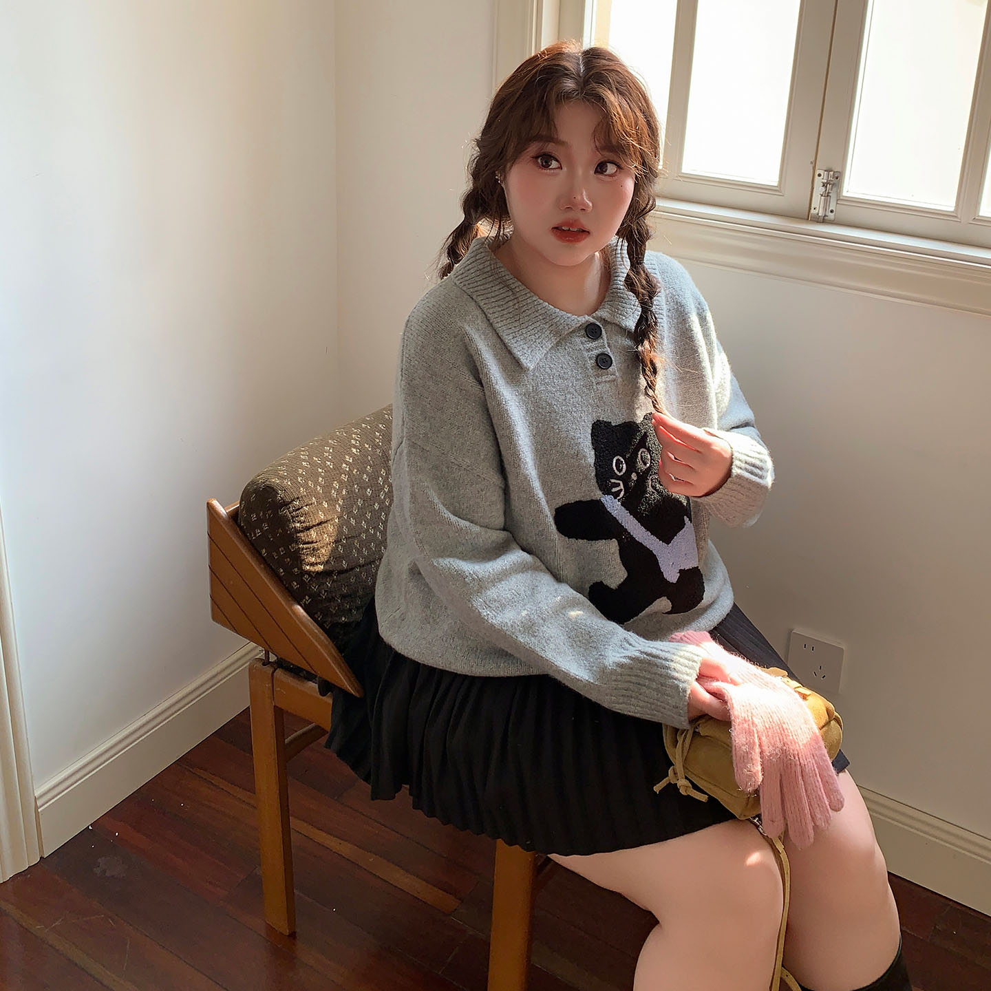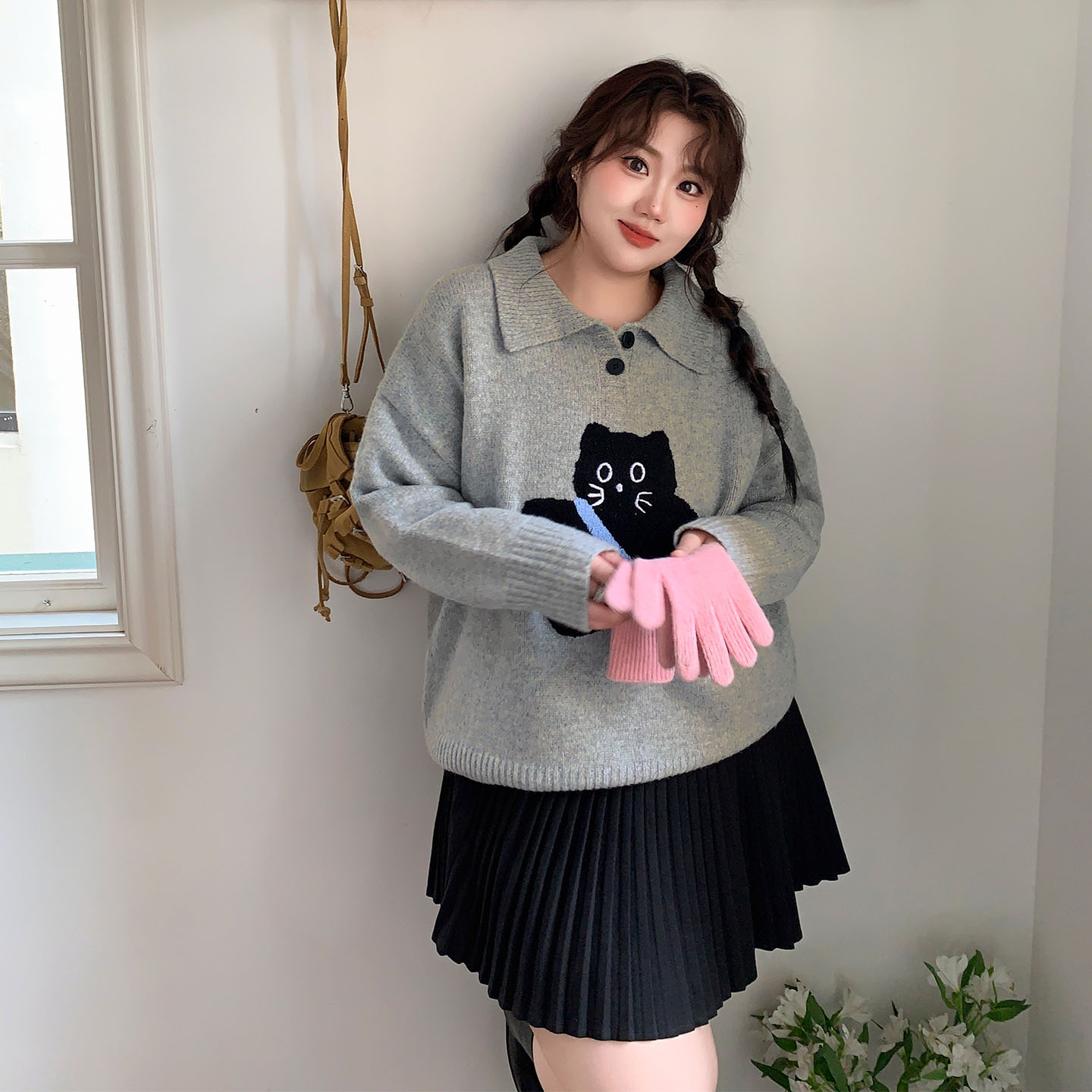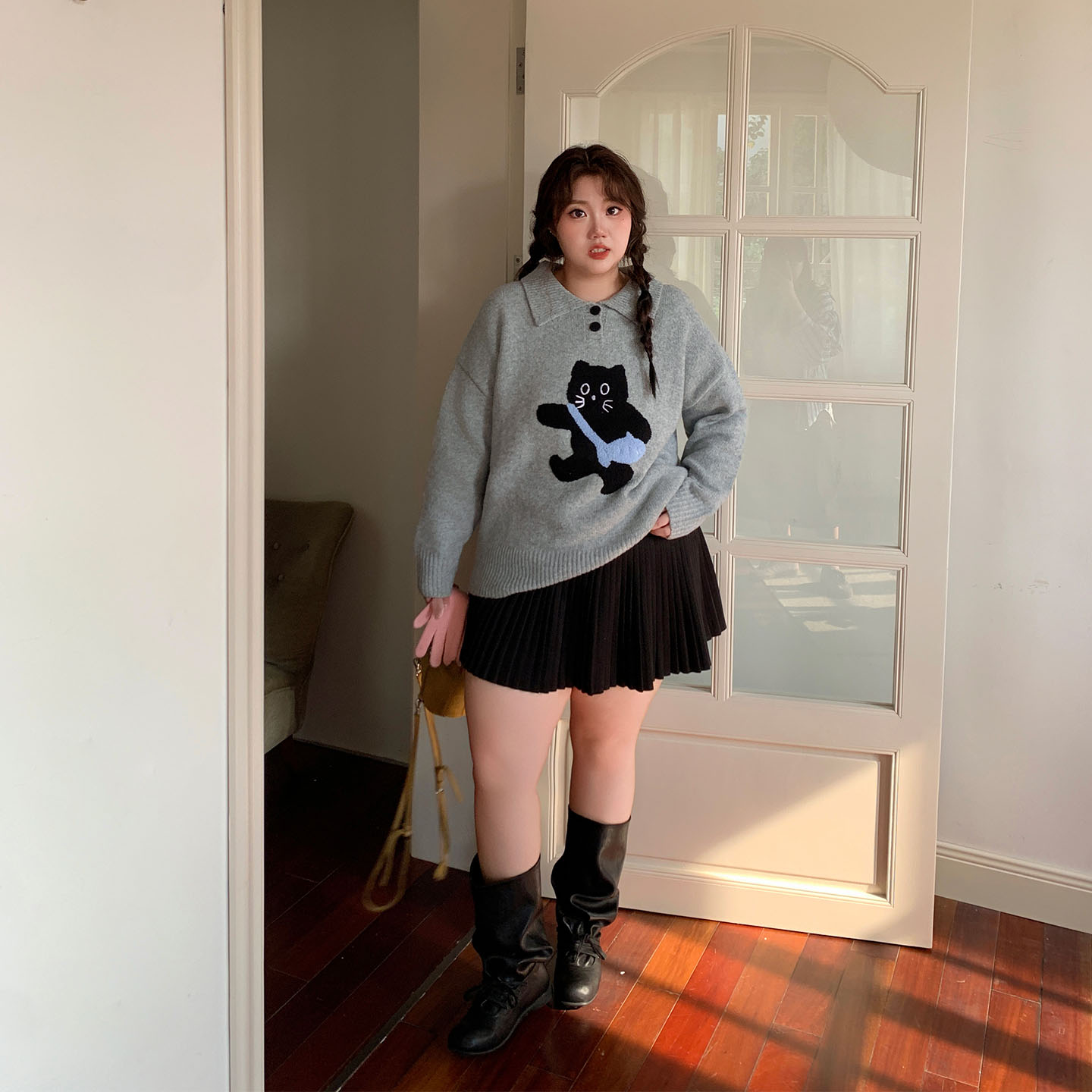 YUZI鱼子可爱毛衣特大码 猫咪刺绣减龄灰色polo领软糯秋冬胖mm 女装